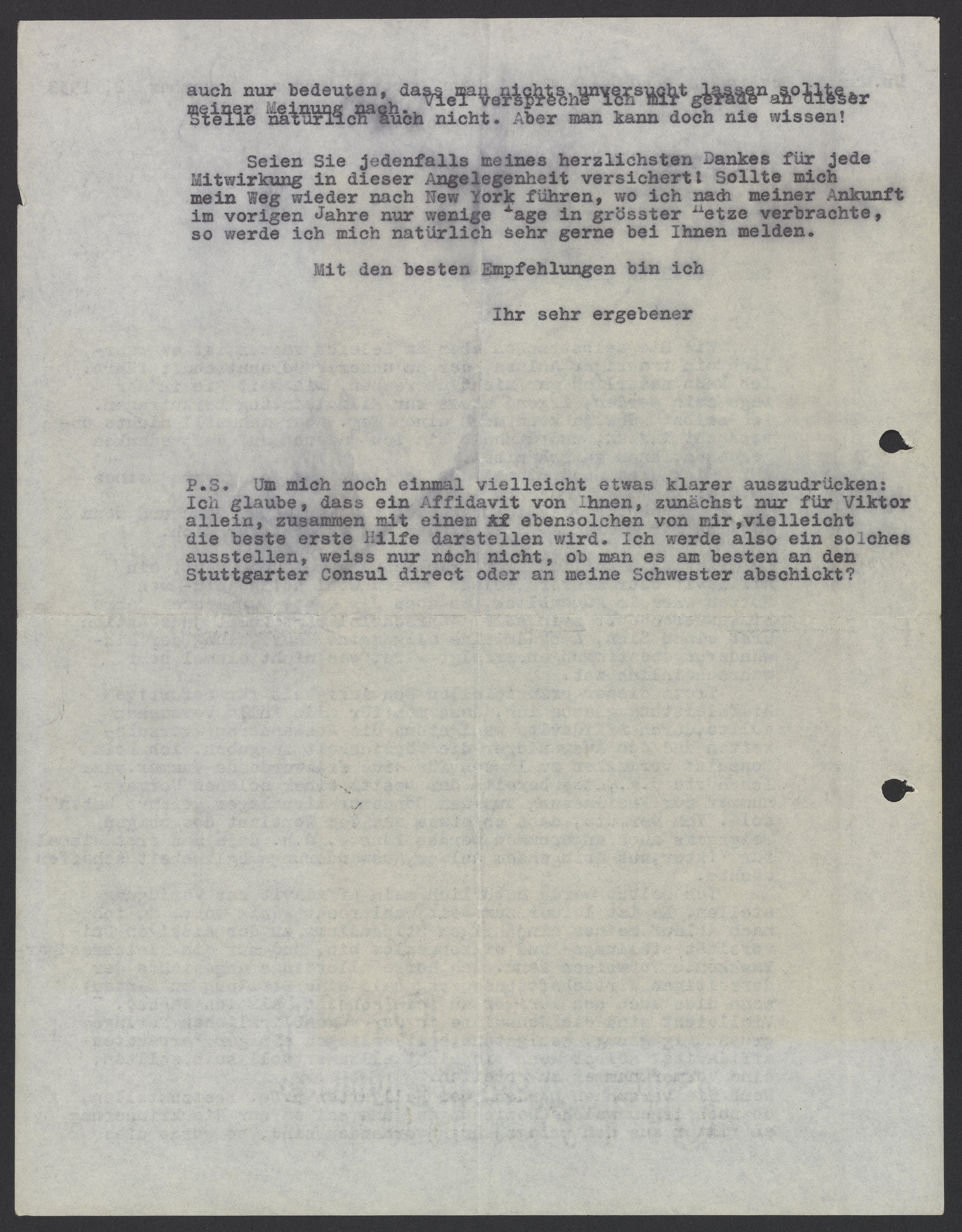 P.S. Um mich einmal vielleicht etwas klarer auszudrücken: Ich glaube, dass ein Affidavit von Ihnen, zunächst für Viktor allein, zusammen mit einem ebensolchen von mir, vielleicht die beste erste Hilfe darstellen wird. Ich werde also ein solches ausstellen, weiss nur noch nicht, ob man es am besten an den Stuttgarter Consul direct oder an meine Schwester abschickt.
