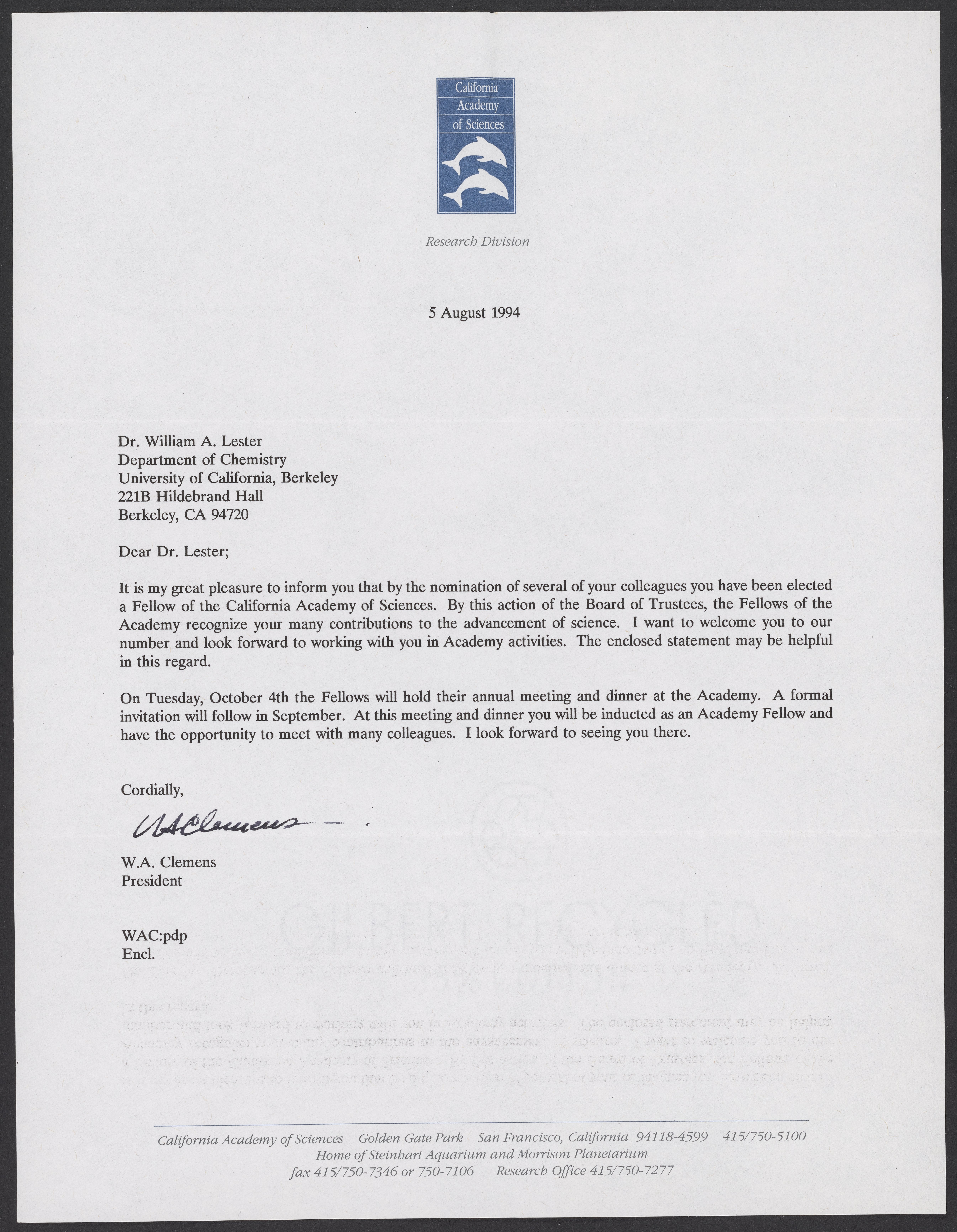 Letter from William A. Clemens, Jr. (1932-2020) to William A. Lester, Jr. (1937-) informing Lester that he has been elected a Fellow of the California Academy of Sciences.