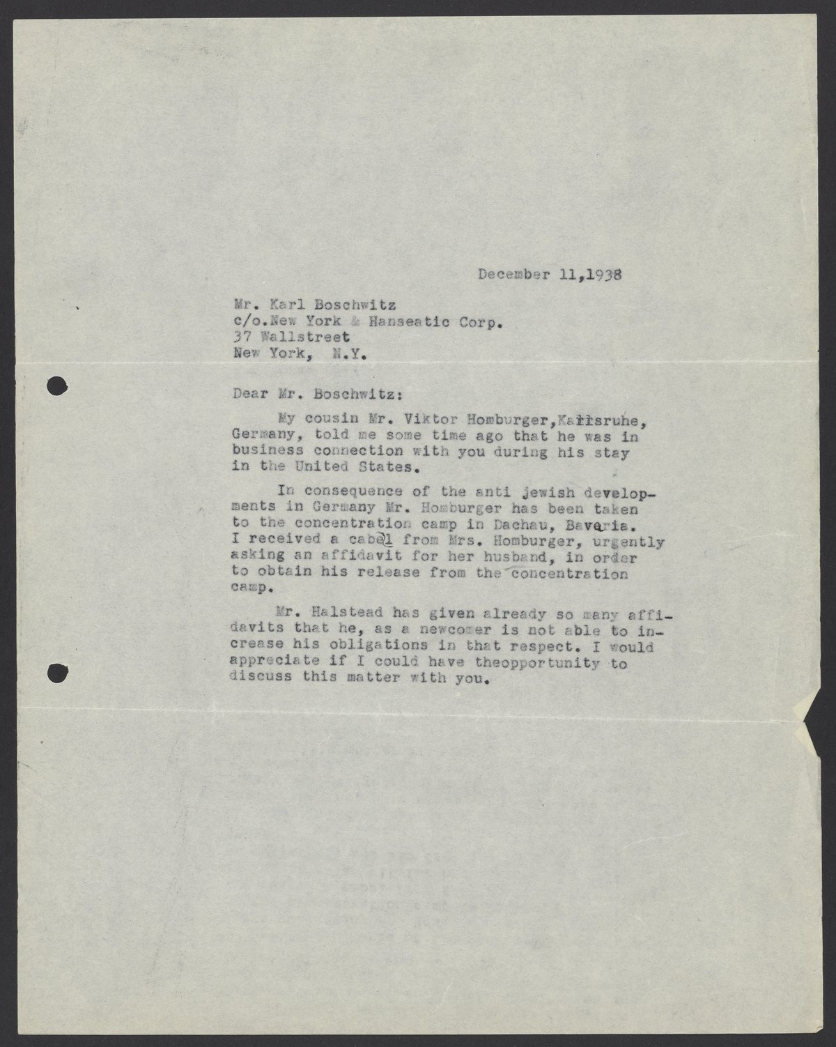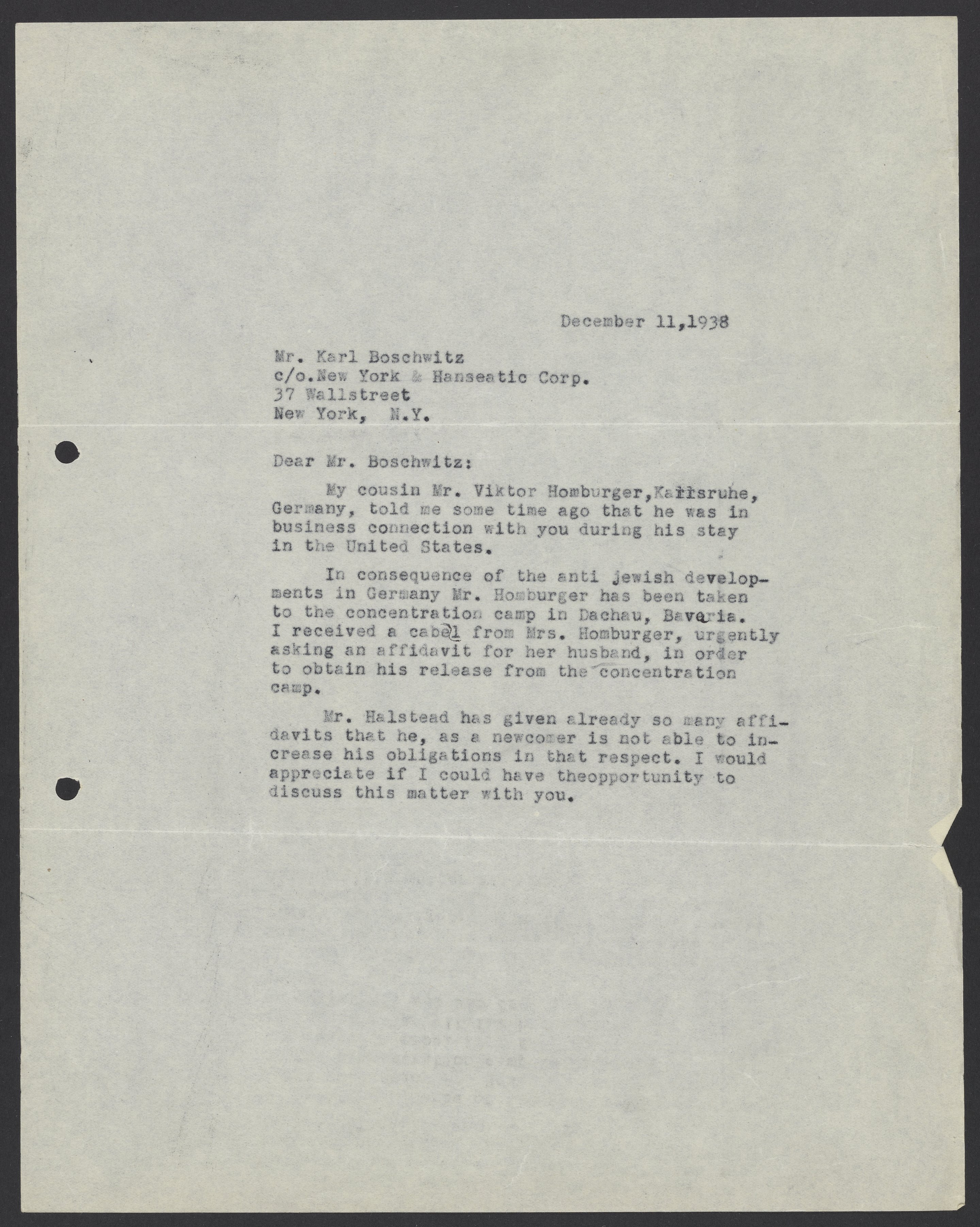 Letter from Max Bredig to Karl Boschwitz, December 1938