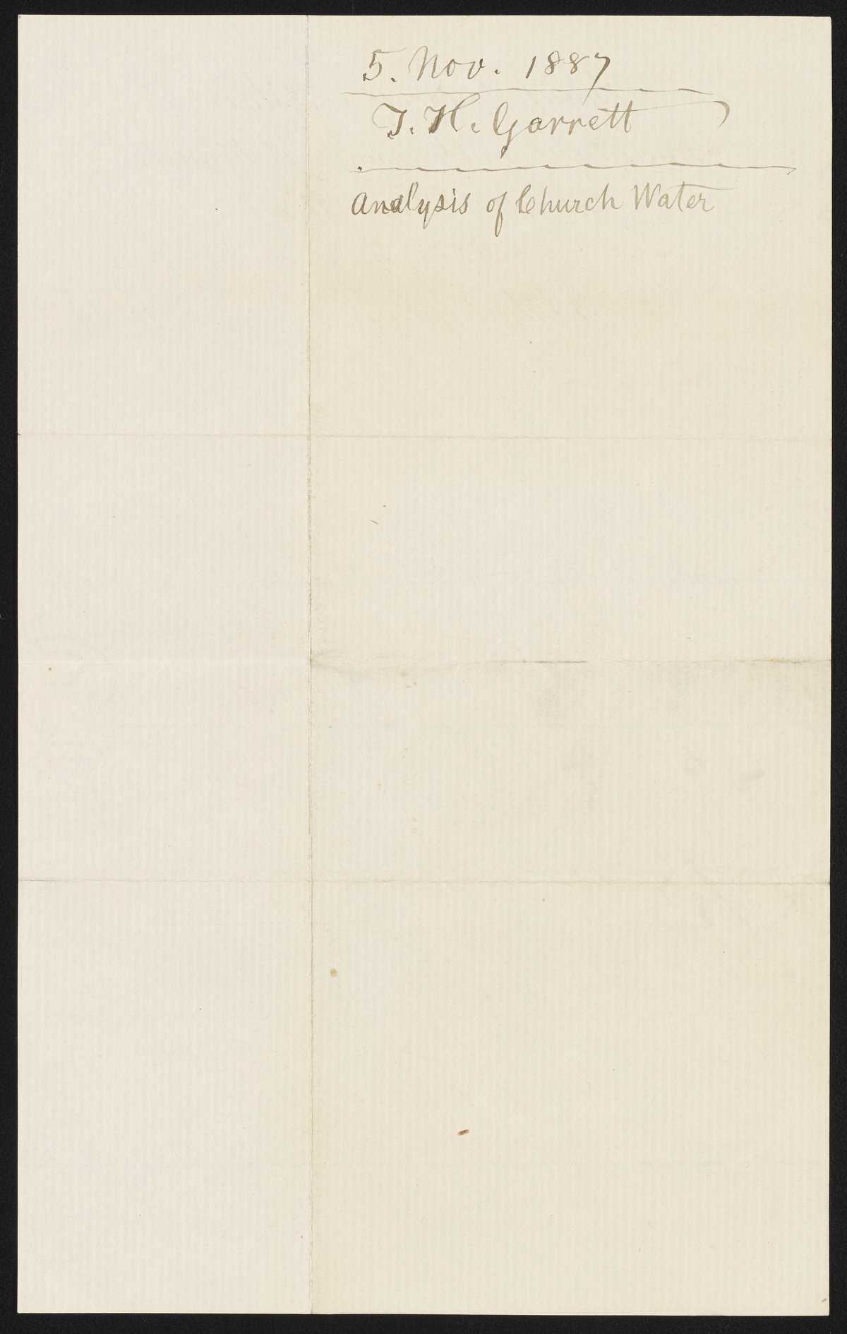 Small JPG1200 x 1883px — 240 KBLarge JPG2880 x 4520px — 1.3 MBFull-sized JPG3194 x 5013px — 1.6 MBOriginal fileTIFF — 3194 x 5013px — 45.9 MBIn 1836, James Booth started a student laboratory in Philadelphia where men could obtain practical training in chemistry - especially analytical chemistry - by personal instruction. With him were associated successively Martin H. Boyé (1812-1909), Thomas H. Garrett, and Andrew A. Blair. In 1878 the firm became Booth, Garrett & Blair. This letter from Thomas H. Garrett concerns local parsonage water analysis.