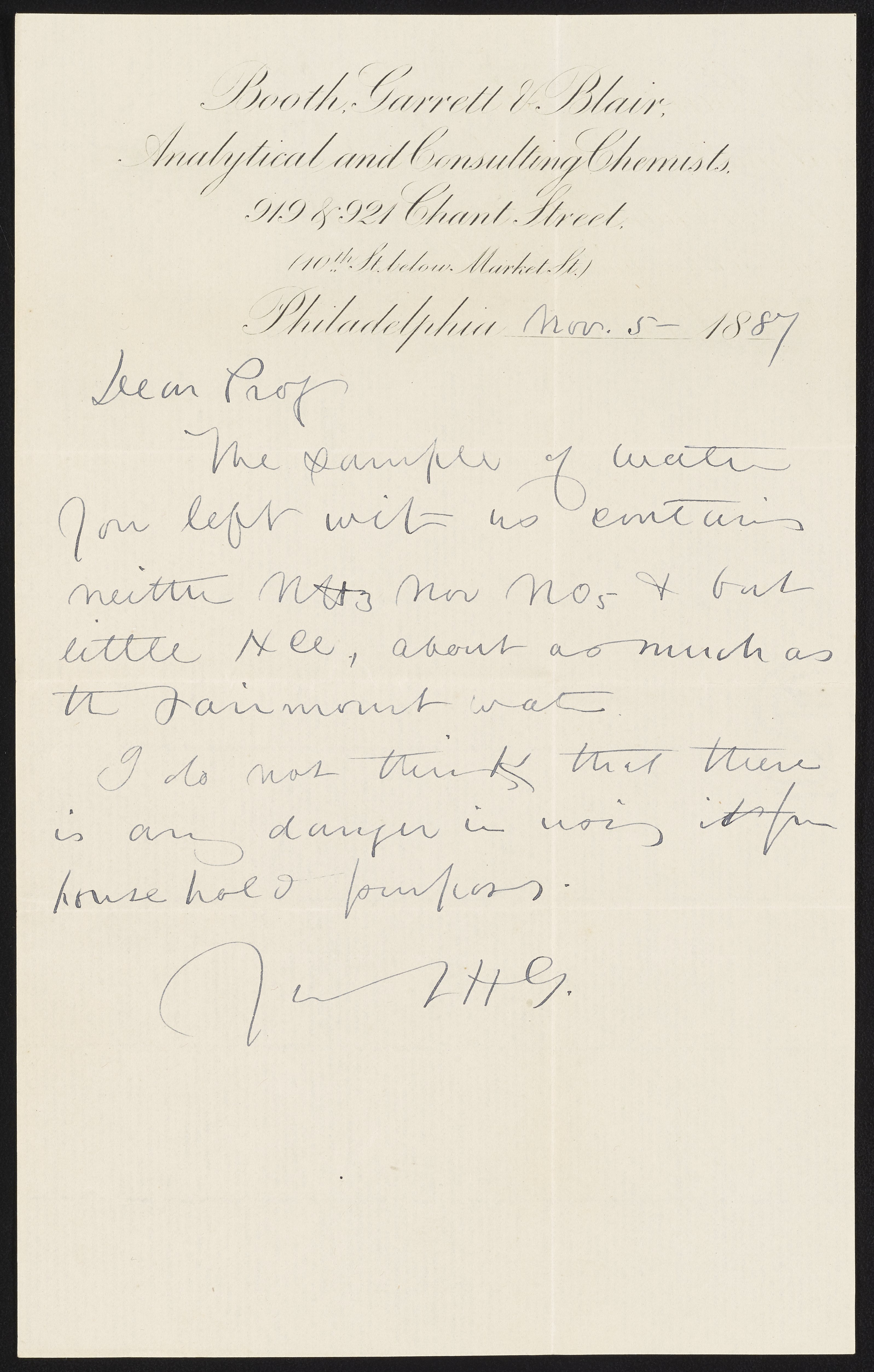 Small JPG1200 x 1883px — 240 KBLarge JPG2880 x 4520px — 1.3 MBFull-sized JPG3194 x 5013px — 1.6 MBOriginal fileTIFF — 3194 x 5013px — 45.9 MBIn 1836, James Booth started a student laboratory in Philadelphia where men could obtain practical training in chemistry - especially analytical chemistry - by personal instruction. With him were associated successively Martin H. Boyé (1812-1909), Thomas H. Garrett, and Andrew A. Blair. In 1878 the firm became Booth, Garrett & Blair. This letter from Thomas H. Garrett concerns local parsonage water analysis.