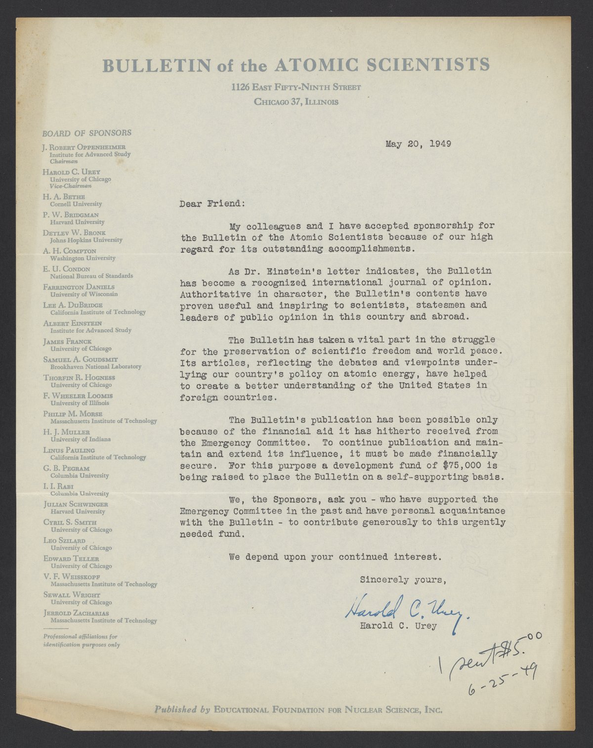 Harold C. Urey (1893-1981) requests donations to the publication fund of the Bulletin of the Atomic Scientists.