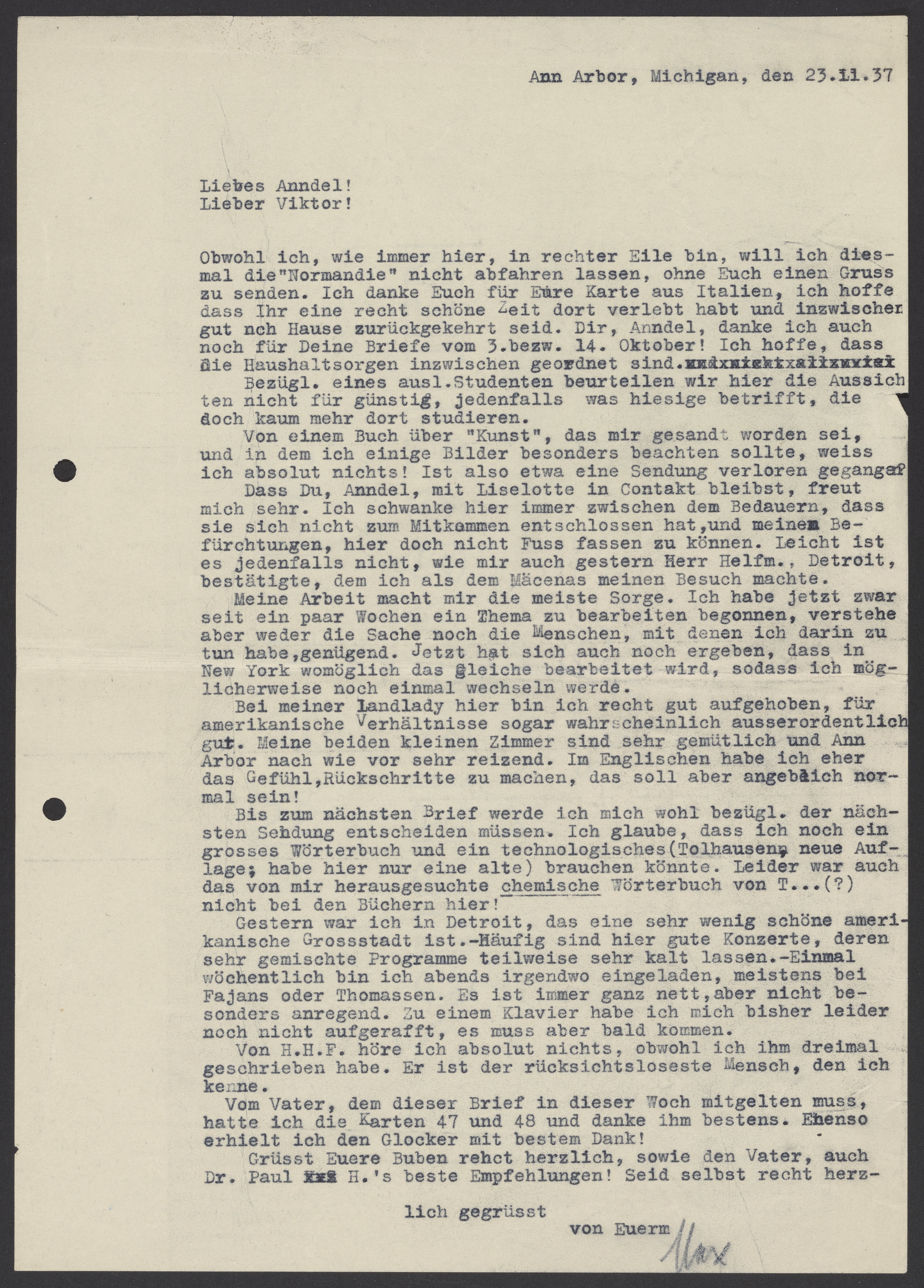 Max Albert Bredig (1902-1977) writes to his sister, Marianne Homburger née Bredig (1903-1986) and her husband, Viktor Homburger (1888-1968) . In the letter he shares personal updates about his work and his life in America. He expresses concern that he may have to switch positions at his place of work in Ann Arbor, Michigan, and shares that H.H.F has yet to reply to his previously sent letters.