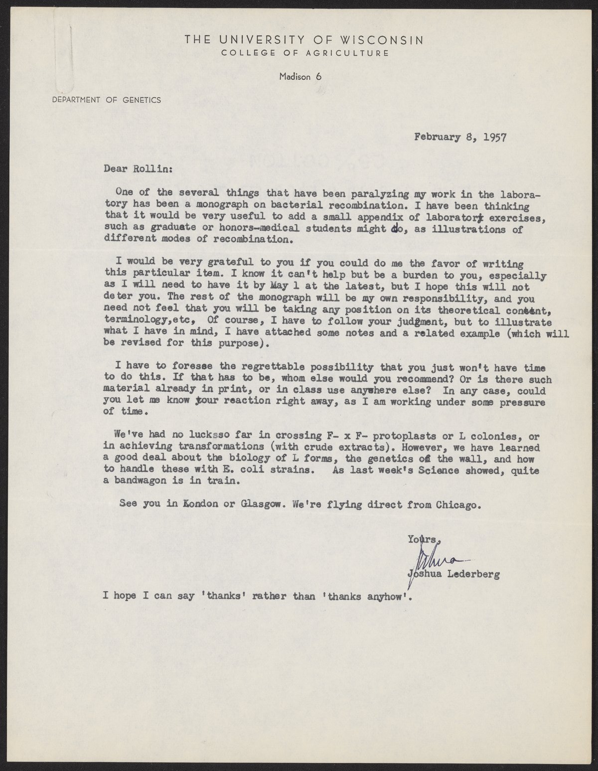 Lederberg, Joshua. “Letter from Joshua Lederberg to Rollin Hotchkiss, February 8, 1957,” February 8, 1957. History of Molecular Biology Collection, Box 14, Folder 12. Science History Institute. Philadelphia. https://digital.sciencehistory.org/works/ozfc2ik.