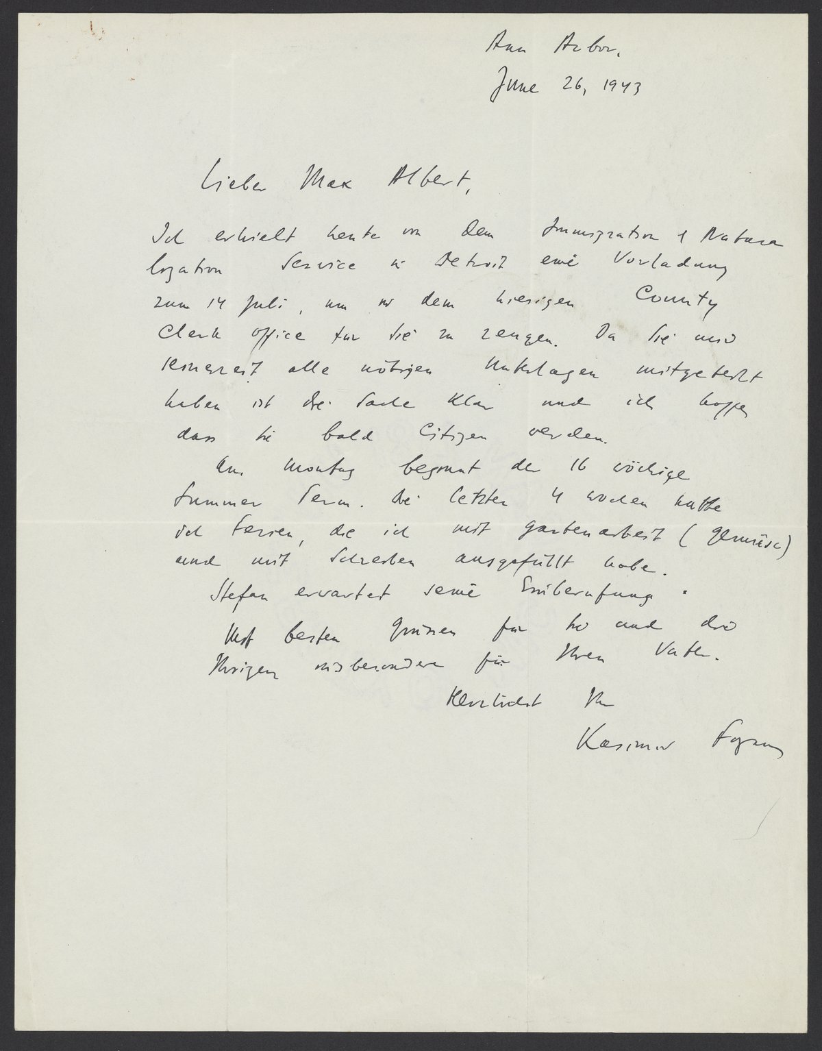 Letter from Kasimir Fajans to Max Bredig, June 26, 1943