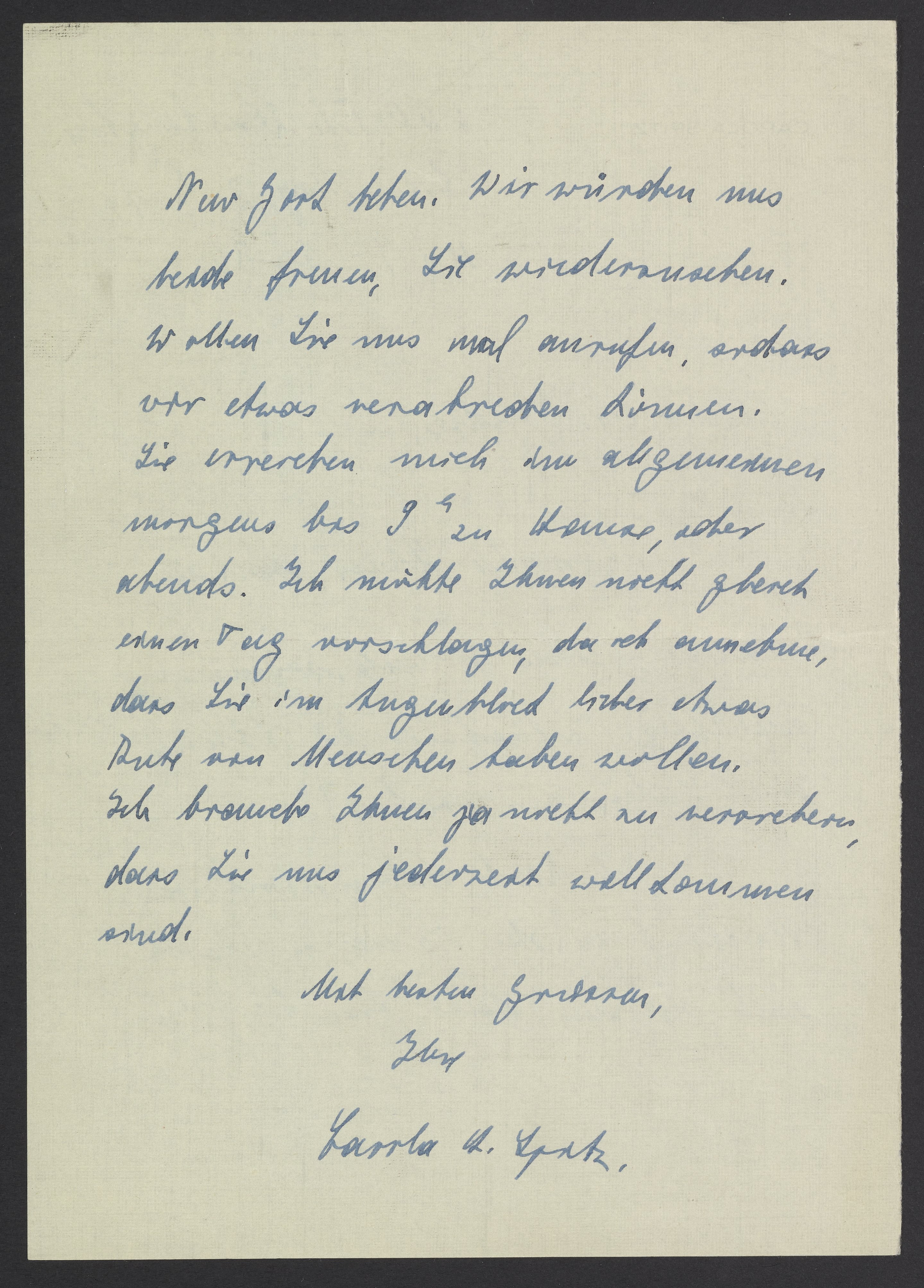New York leben. Wir würden uns beide freuen, Sie wiederzusehen. Wollen Sie uns mal anrufen, sodass wir etwas verabreden können. Sie erreichen mich im Allgemeinen morgen bis 9 Uhr zu Hause, oder abends. Ich möchte Ihnen nicht gleich einen Tag vorschlagen, da ich vermute, dass Sie im Augenblick lieber etwas Ruhe von Menschen haben wollen.