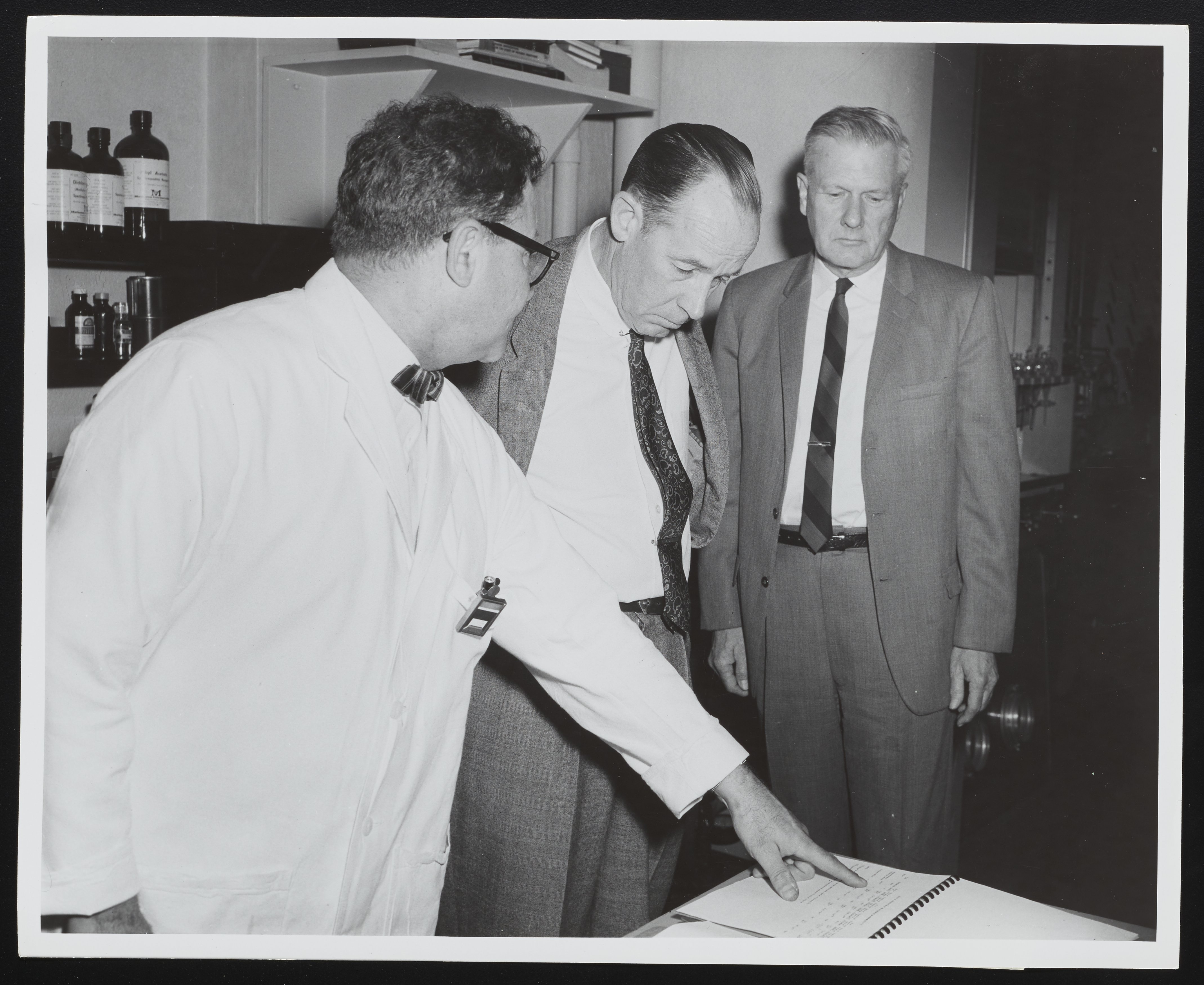 Three chemists in the Nuclear Chemistry Laboratory at the Naval Air Engineering Center in Johnsville, Pennsylvania. The individuals in the photograph are identified as follows (from left): Alfred Glass (Chemist); Dr. Edwin S. Lamar (Chief Scientist, Naval Air Systems Command); and Dr. G.K. Holmes (Division Superintendent).