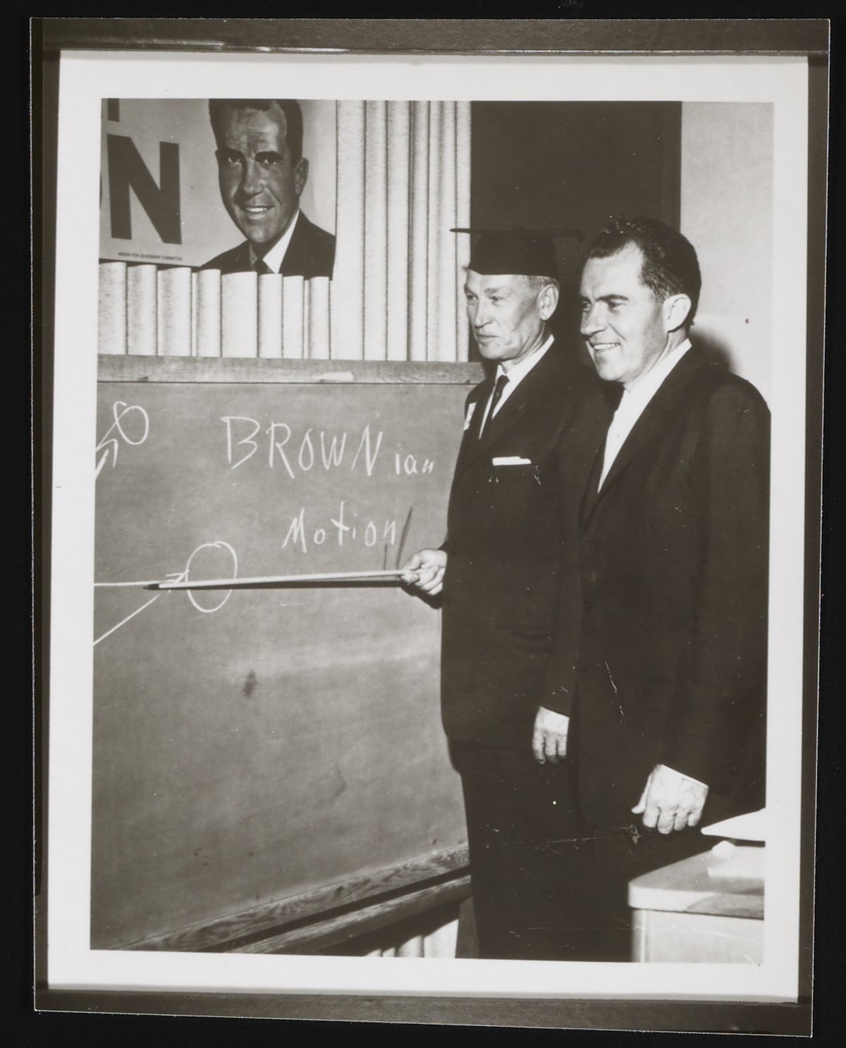 Arnold Beckman supported former Vice President Richard Nixon in his unsuccessful 1962 campaign for governor of California, including speaking at a campaign rally. In this image "Professor Beckman" gives a lecture on "Brownian motion" that critiqued Nixon's opponent in the race, Edmund (Pat) Brown (1905-1996). Beckman's scientific joke largely went over the heads of the audience at this event. Nixon would go on to serve as the 37th President of the United States from 1969 to 1974.