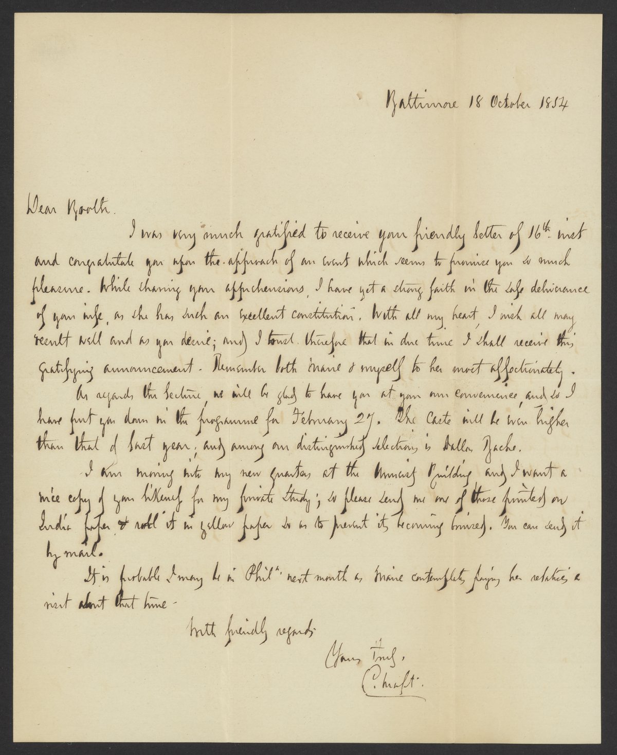 Small JPG1200 x 1468px — 227 KBLarge JPG2880 x 3524px — 927 KBFull-sized JPG2908 x 3558px — 940 KBOriginal fileTIFF — 2908 x 3558px — 29.7 MBCampbell Morfit (1820-1897), a distinguished chemist, co-editor with James Curtis Booth (1810-1888) of the Encyclopedia of Chemistry (1850), writes to commiserate with Booth on the occaision of Mrs. Booth taking ill.