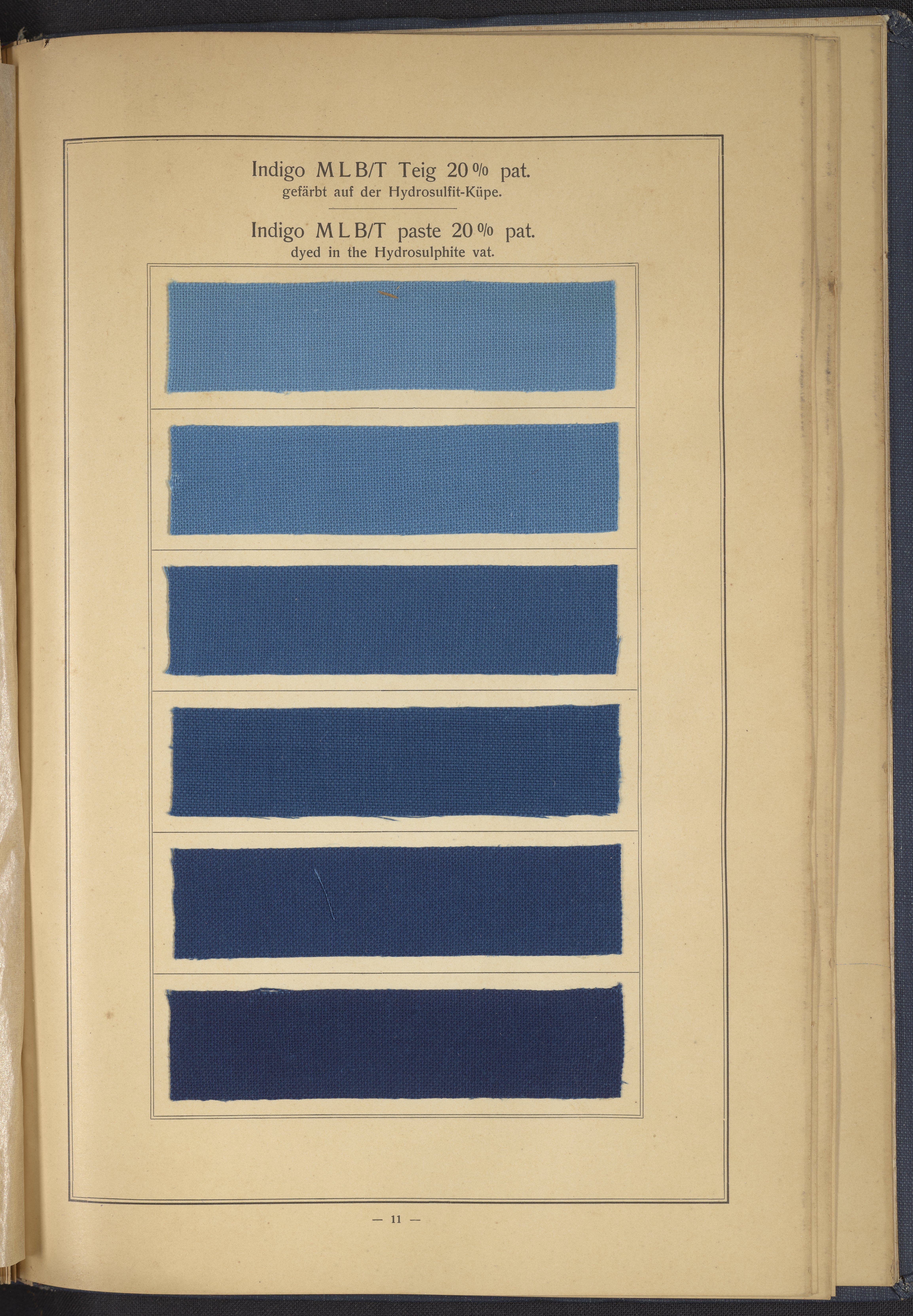 Small JPG1200 x 1634px — 431 KBLarge JPG2880 x 3920px — 2.7 MBFull-sized JPG4863 x 6619px — 7.0 MBOriginal fileTIFF — 4863 x 6619px — 92.2 MBThis sample book begins with a selection of recipes for the preparation of dye vats. Each recipe lists the solvents and solutes necessary to mix large-volume solutions of indigo textile dye using Indigo M.L.B. brand powdered dye, a synthetic indigo created using the "Pfleger indigo process," the first commercial process of indigo dye production. The recipes are followed by a series of protocols for indigo "resists" or the media used to prevent dye from penetrating the textile. Resist-dyeing is a traditional method used to create patterned designs on textiles. Substances are used to "resist" or prevent the dye from reaching all the cloth, thereby creating a pattern. Finally, the work contains 16 plates of mounted yarn and fabric samples demonstrating the outcomes of the preceding recipes.