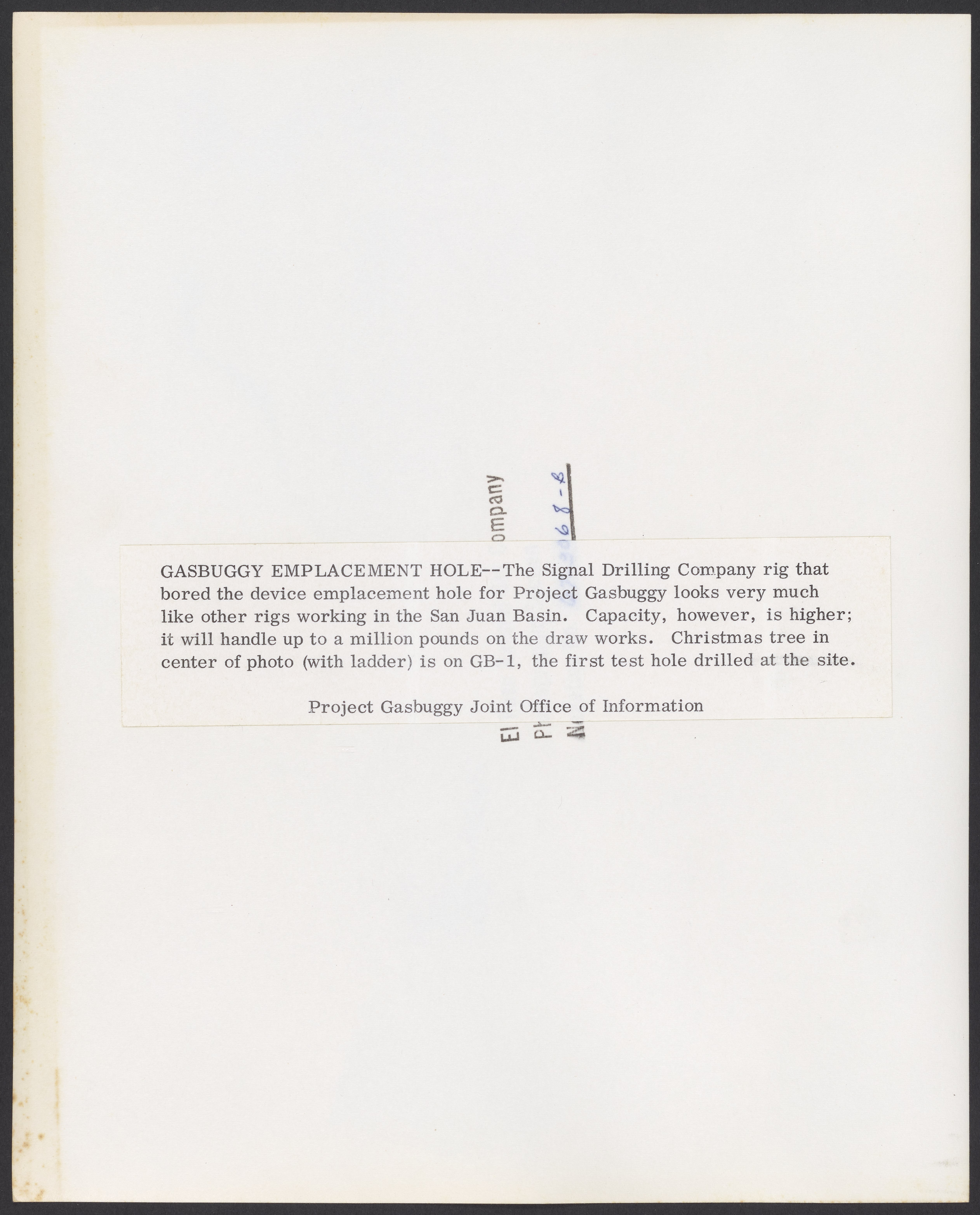 Small JPG1200 x 1480px — 278 KBLarge JPG2880 x 3552px — 1.1 MBFull-sized JPG5076 x 6260px — 2.8 MBOriginal fileTIFF — 5076 x 6260px — 91.0 MBBlack and white photograph of the Signal Drilling Company rig that bored the device emplacement hole for Project Gasbuggy. Also shows the first test hole drilled at the site.