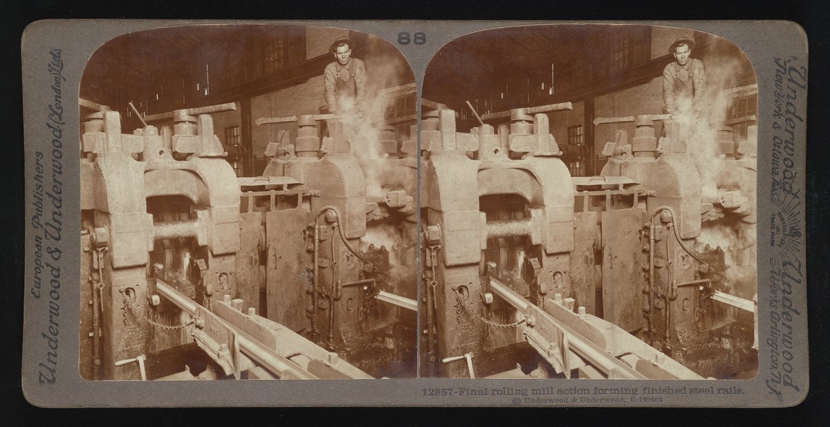 “Final Rolling Mill Action Forming Finished Steel Rails.” Underwood & Underwood, n.d. Underwood & Underwood Stereographs of Manufacturing Industries. Science History Institute. Philadelphia. https://digital.sciencehistory.org/works/p5547r37h.