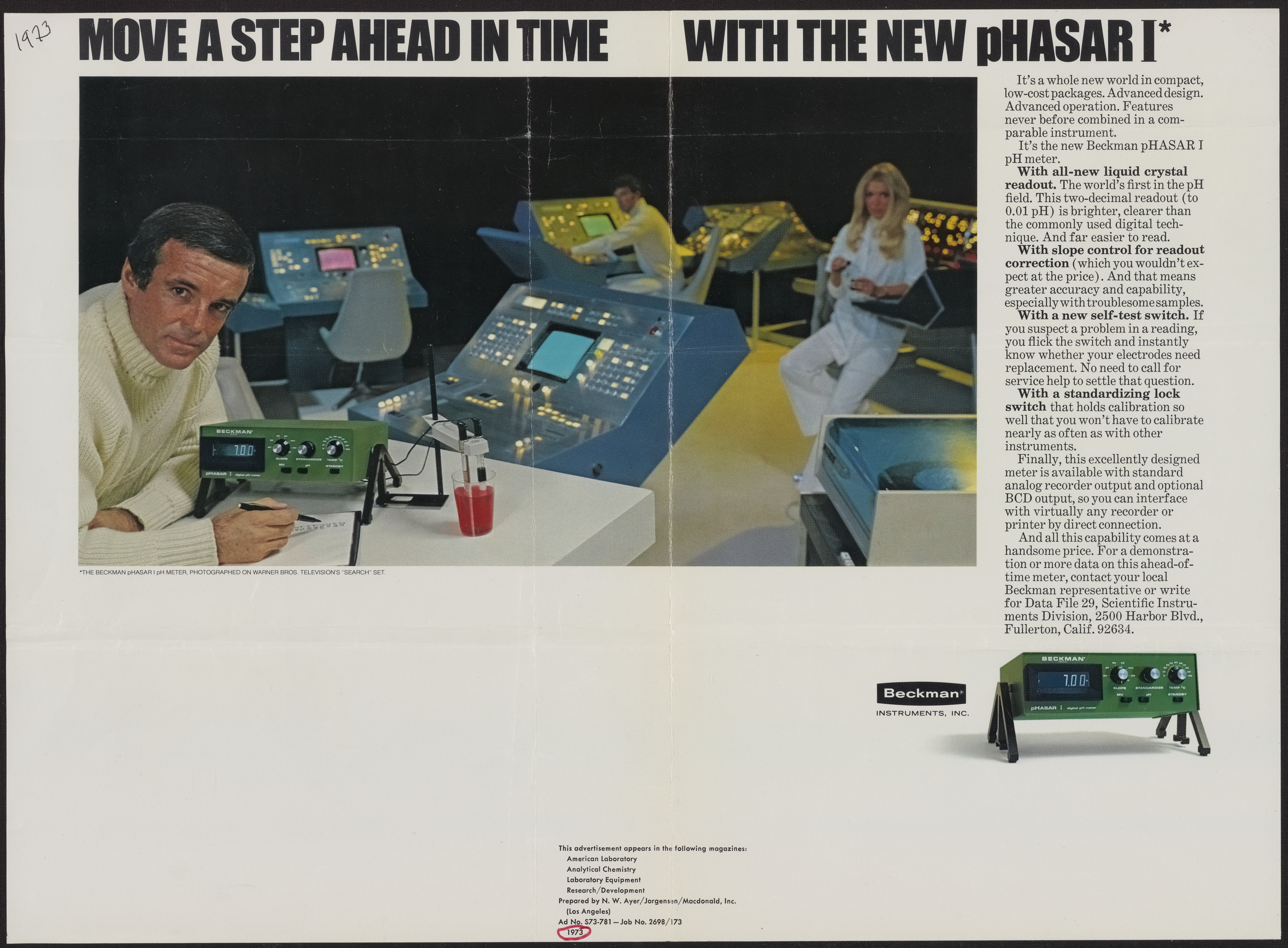 This advertisement for the Beckman Instruments' pHASAR I pH meter is staged on the set of the 1973 science fiction television show, Search.