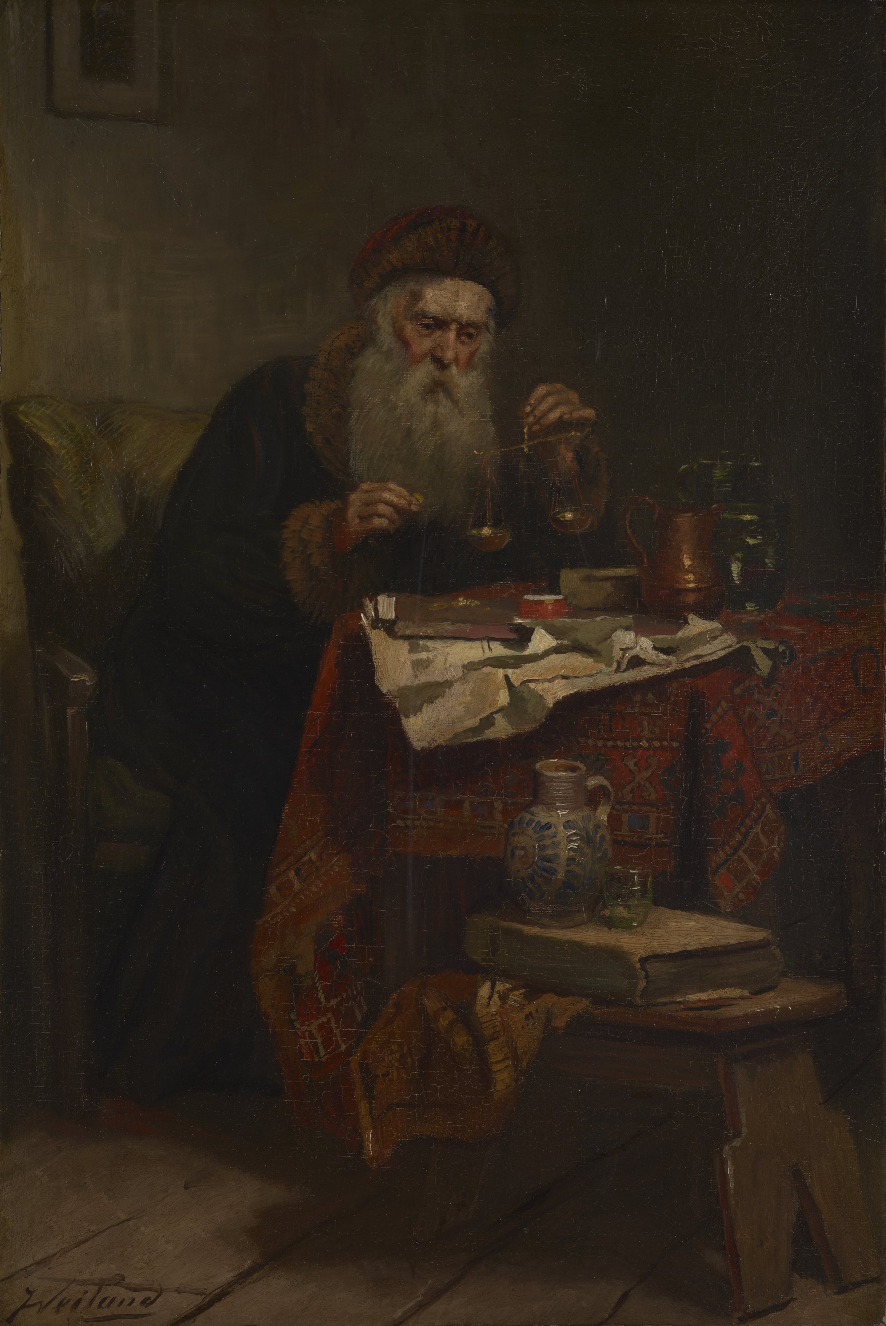 A bearded alchemist wearing a fur-trimmed top coat and cap is carefully weighing ingredients with a balance. On top of his table is an exotic carpet covered with papers, a copper pitcher, and ceramic jar. Resting on a simple wooden bench in front of the table is a large book and jug with blue glaze marks and glass. The painting's focus on the alchemist's measured actions seems to carry a message of weighted judgment.