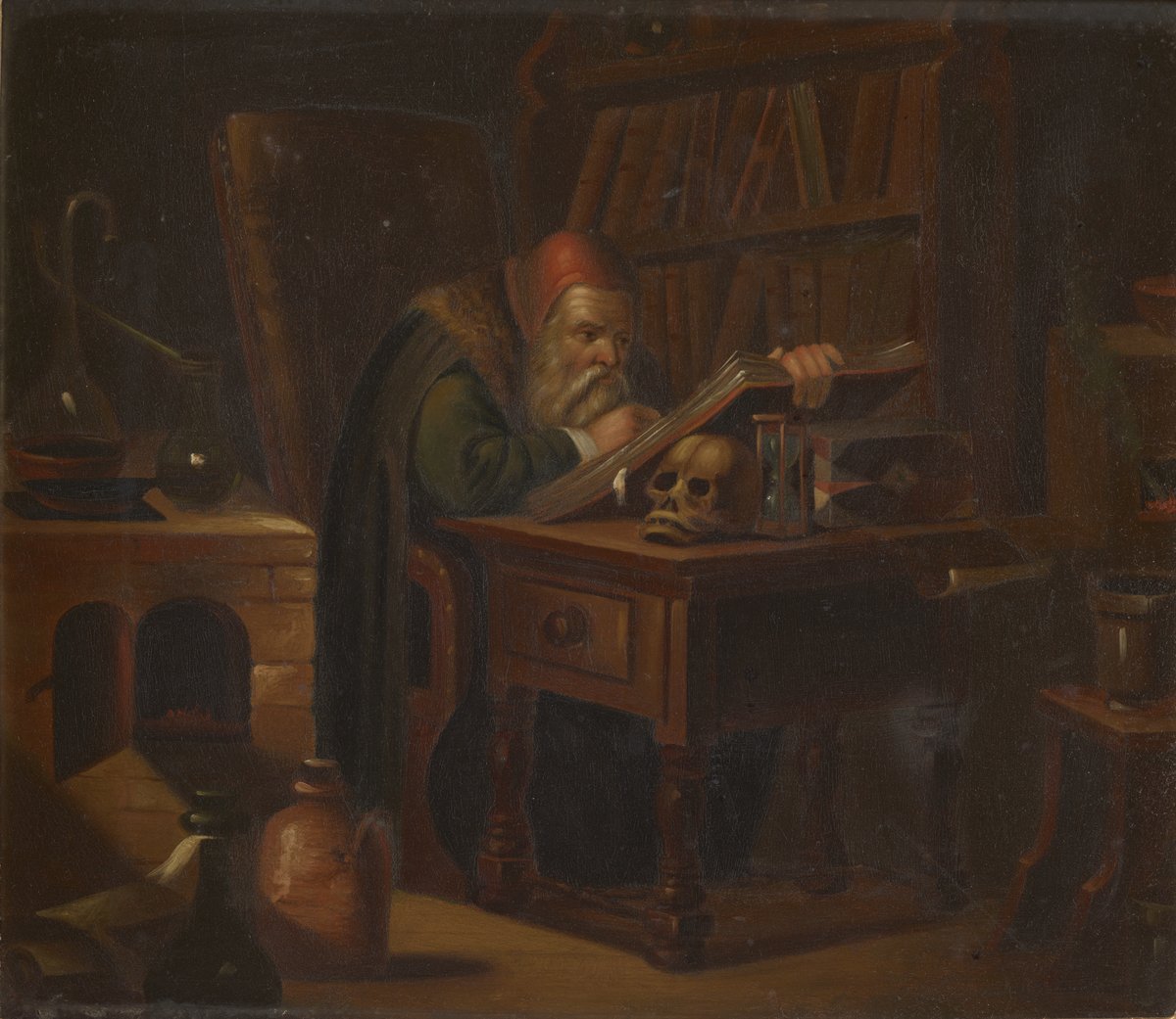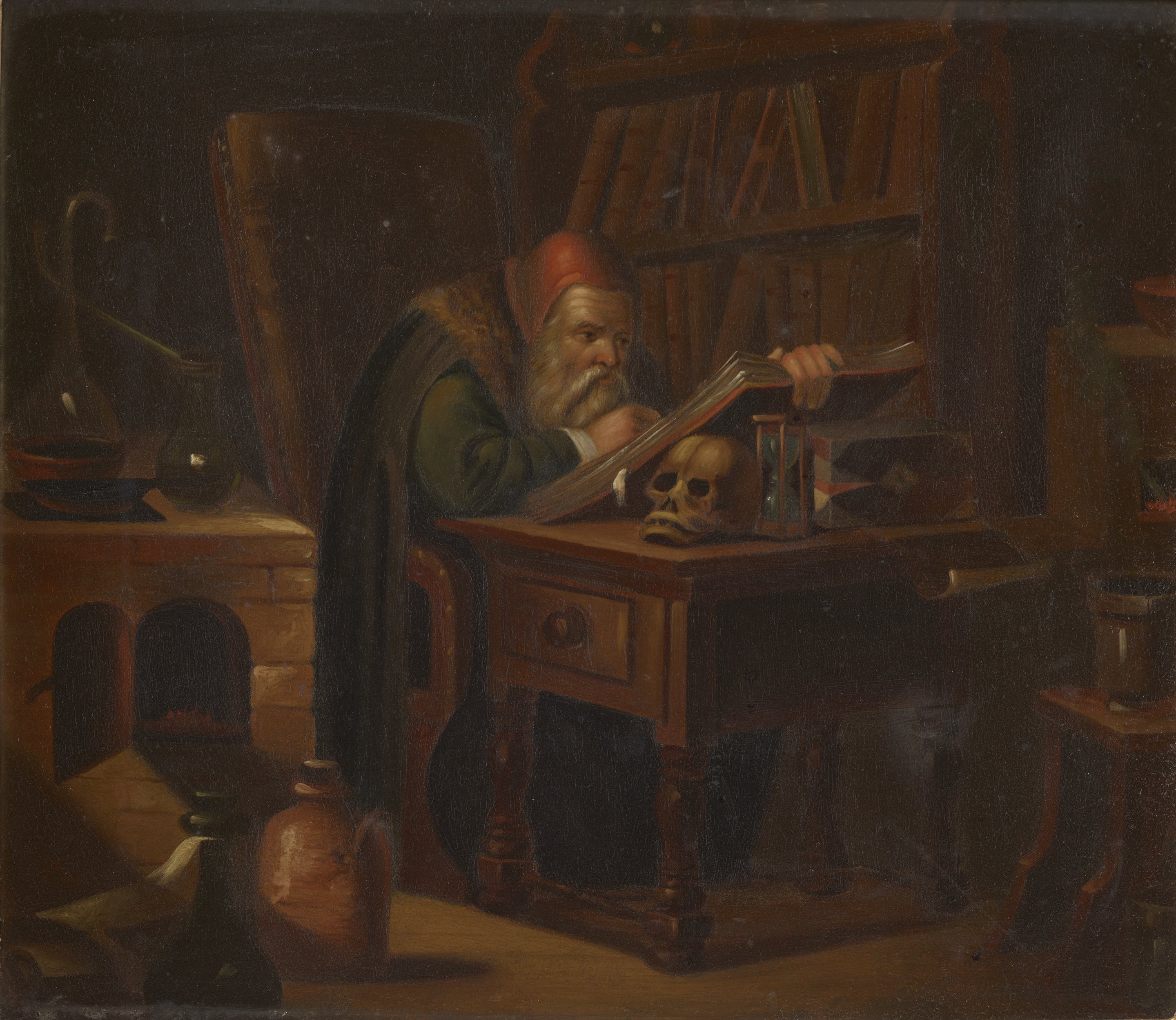 Alchemist at Work (with Book Resting on Skull). Oil paint (paint), metal, n.d. Science History Institute. Philadelphia. https://digital.sciencehistory.org/works/p5547s59r.