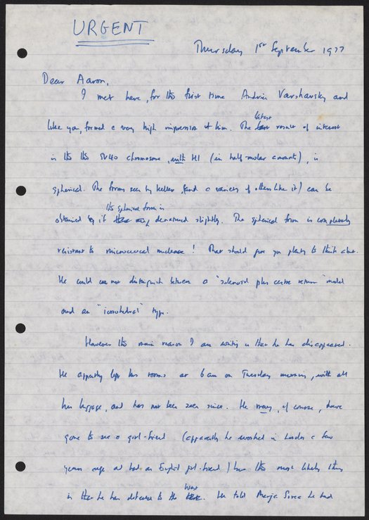 Letter from Francis Crick to Aaron Klug, September 1, 1977