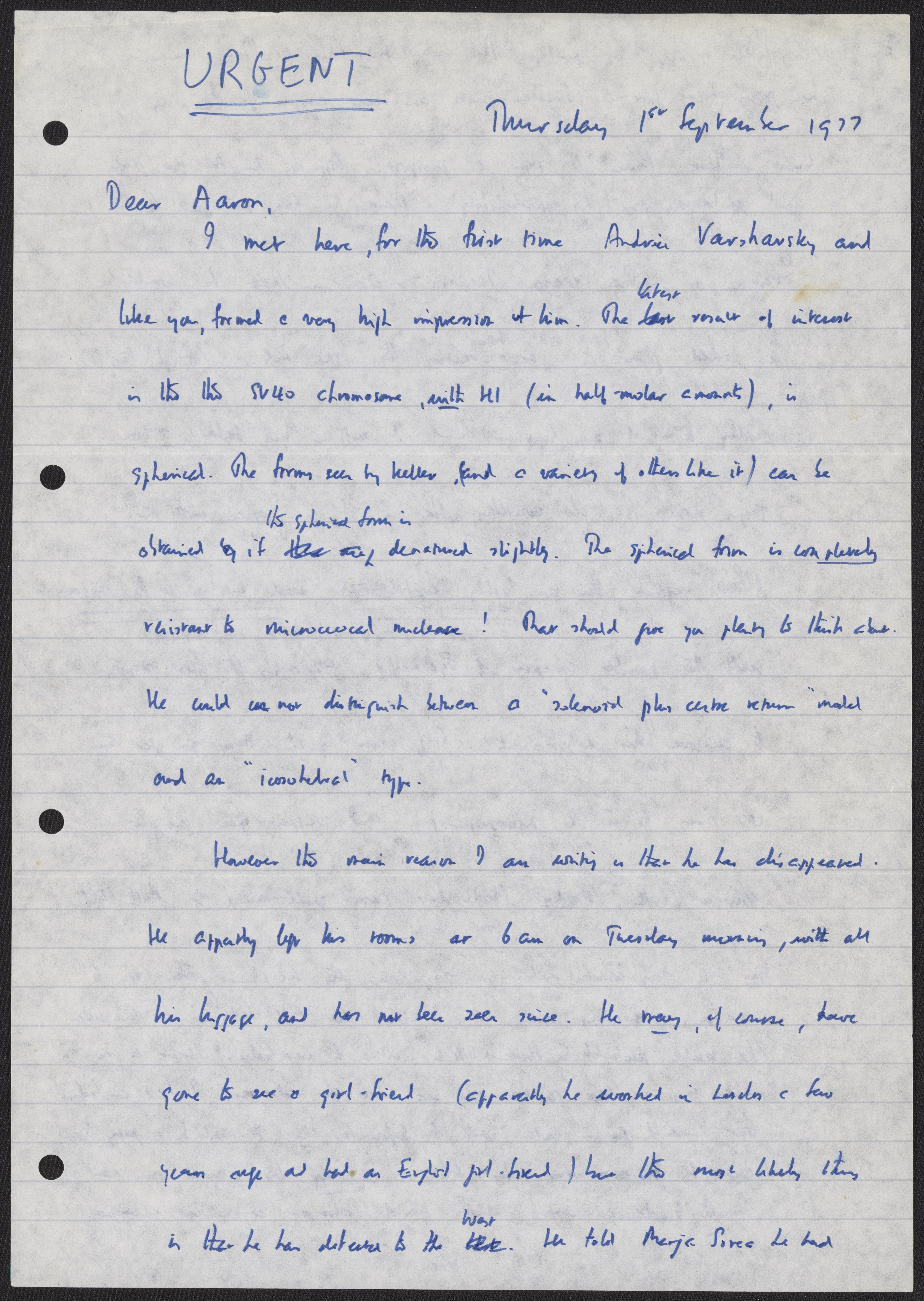 Letter from Francis Crick to Aaron Klug, September 1, 1977