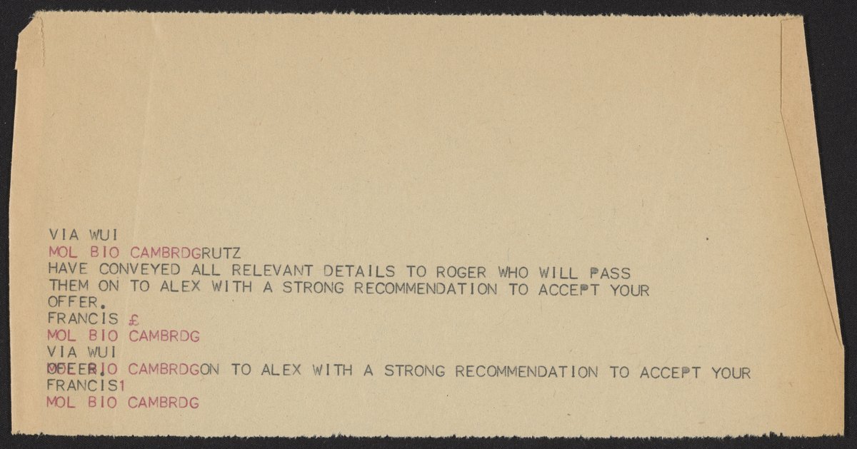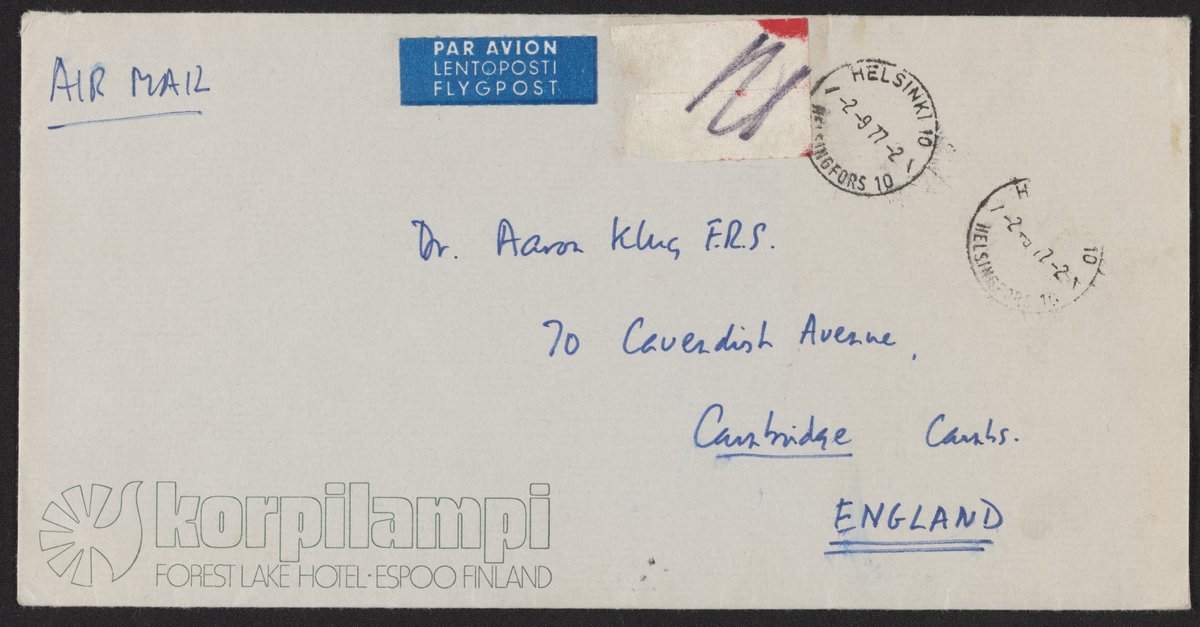 Small JPG1200 x 1689px — 316 KBLarge JPG2880 x 4053px — 1.7 MBFull-sized JPG5170 x 7276px — 5.1 MBOriginal fileTIFF — 5170 x 7276px — 108 MBFrancis Crick (1916-2004) writes an urgent letter to Aaron Klug (1926-2018). Included is an envelope, a telegram, and scrap paper.