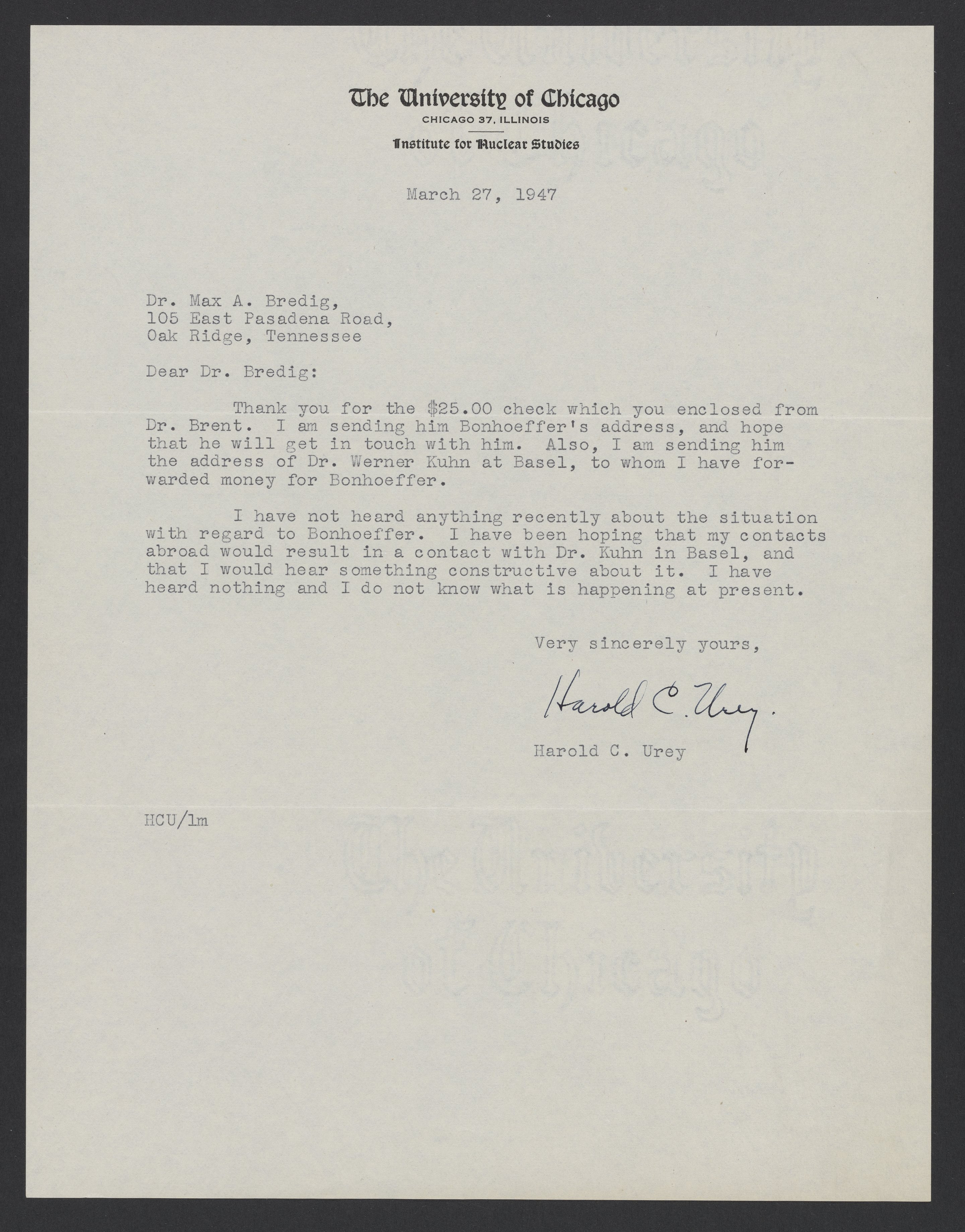 Letter from Harold C. Urey to Max Bredig, March 27, 1947