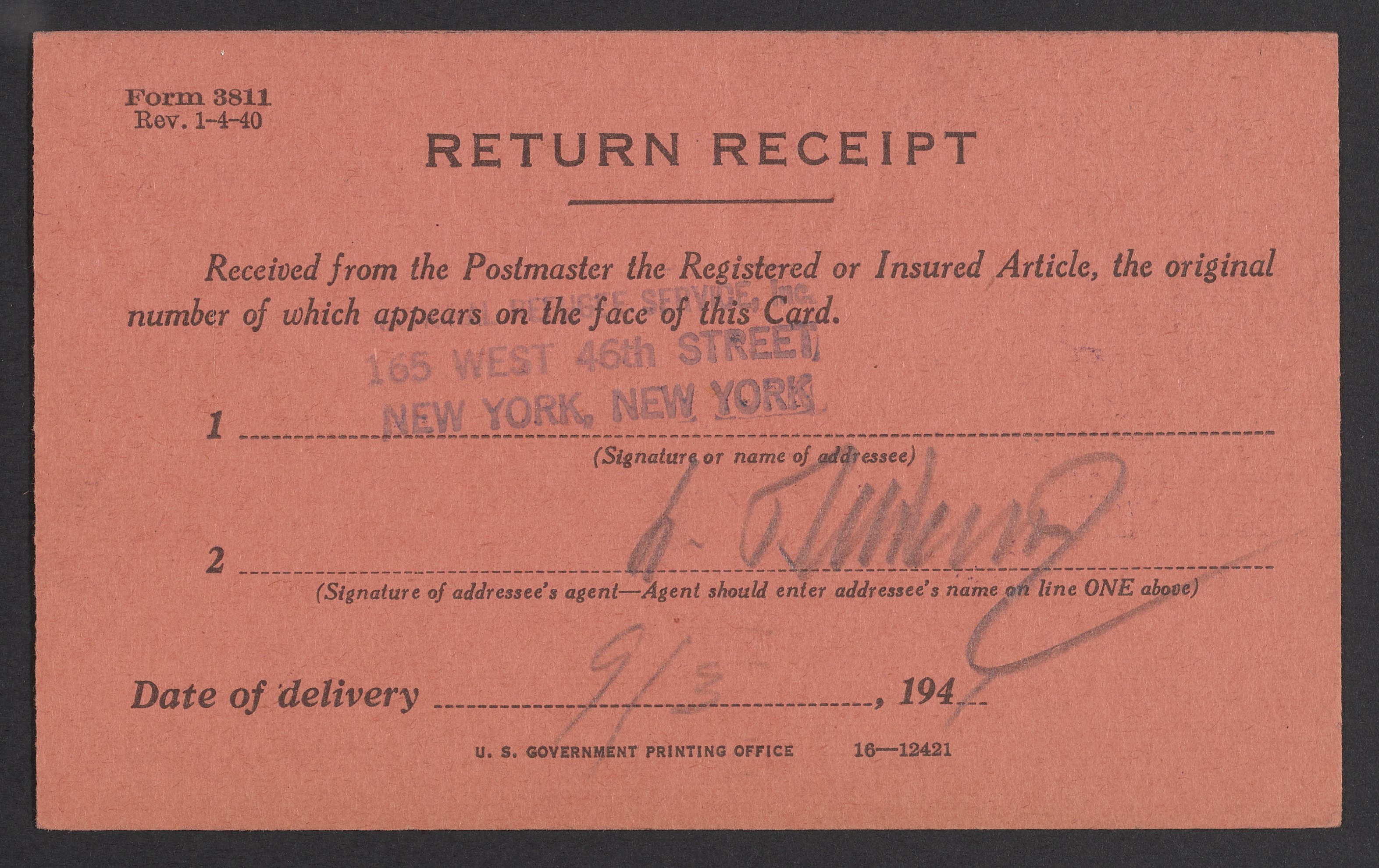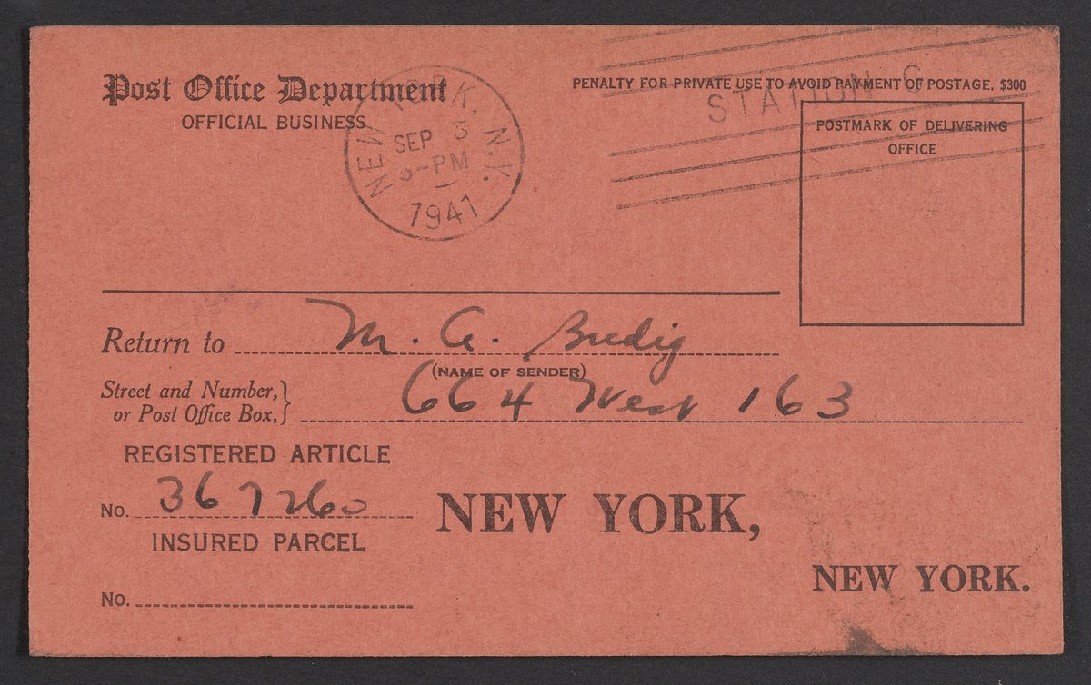Return receipts from Max Bredig's package shipments