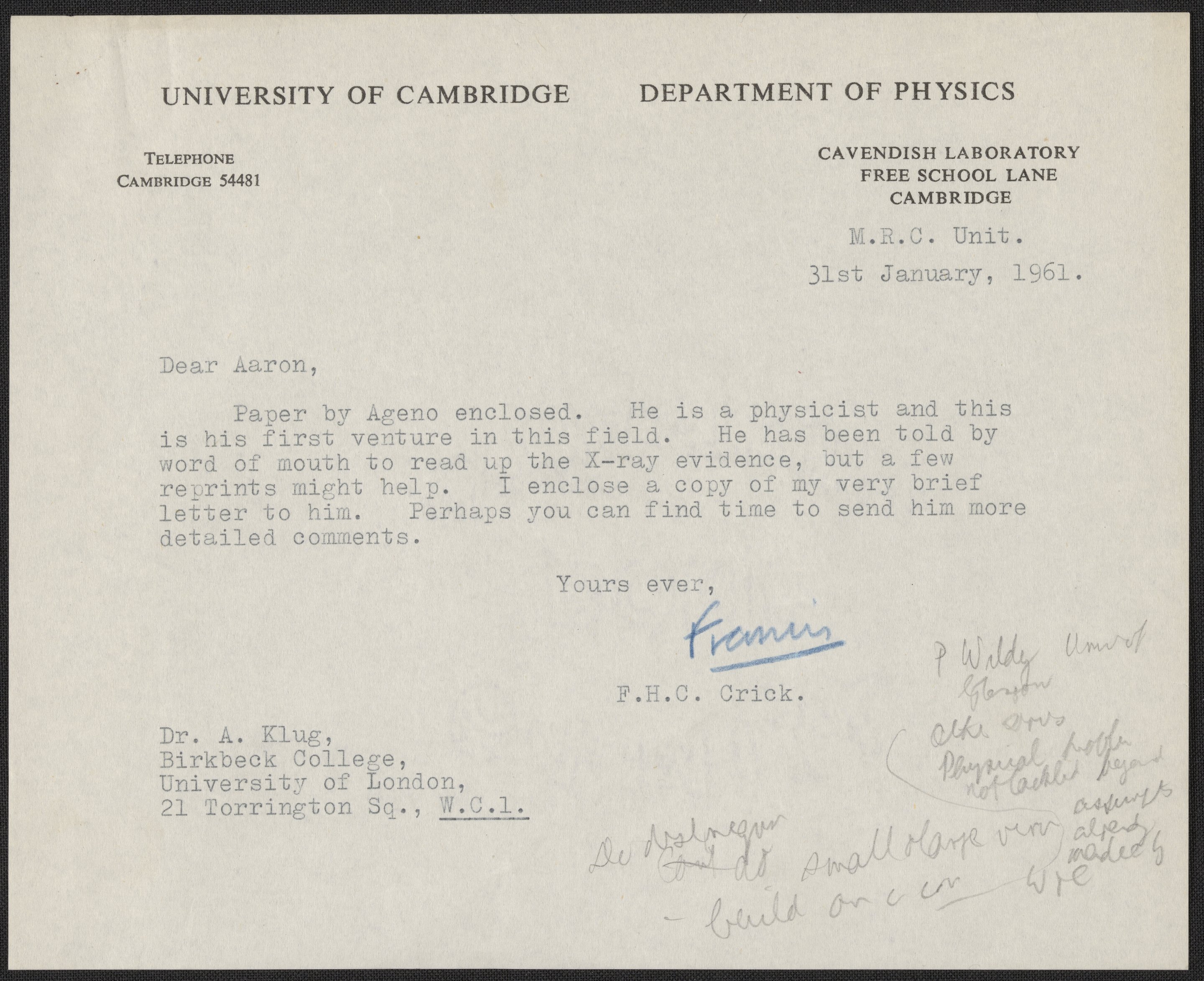 Paper written by Mario Ageno sent from Francis Crick to Aaron Klug
