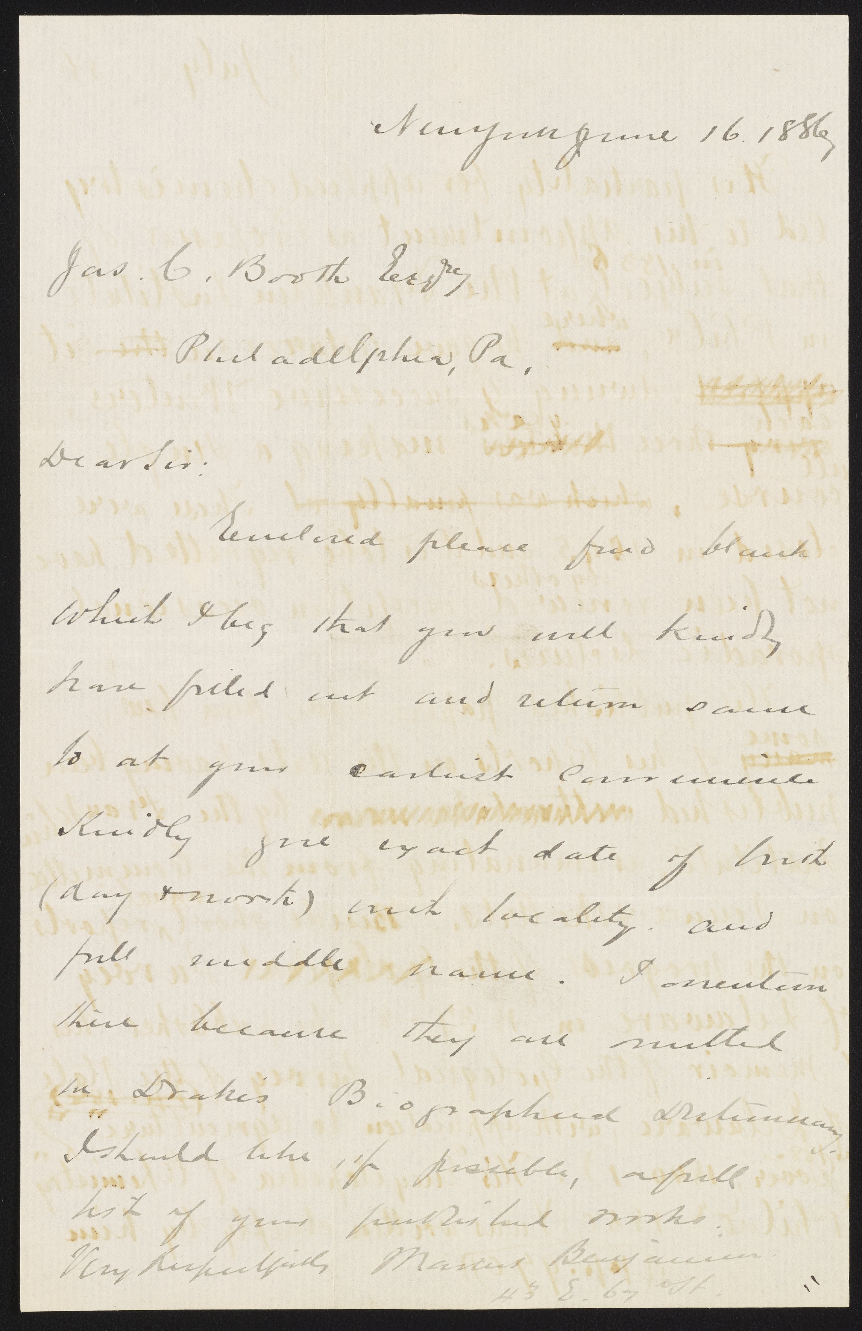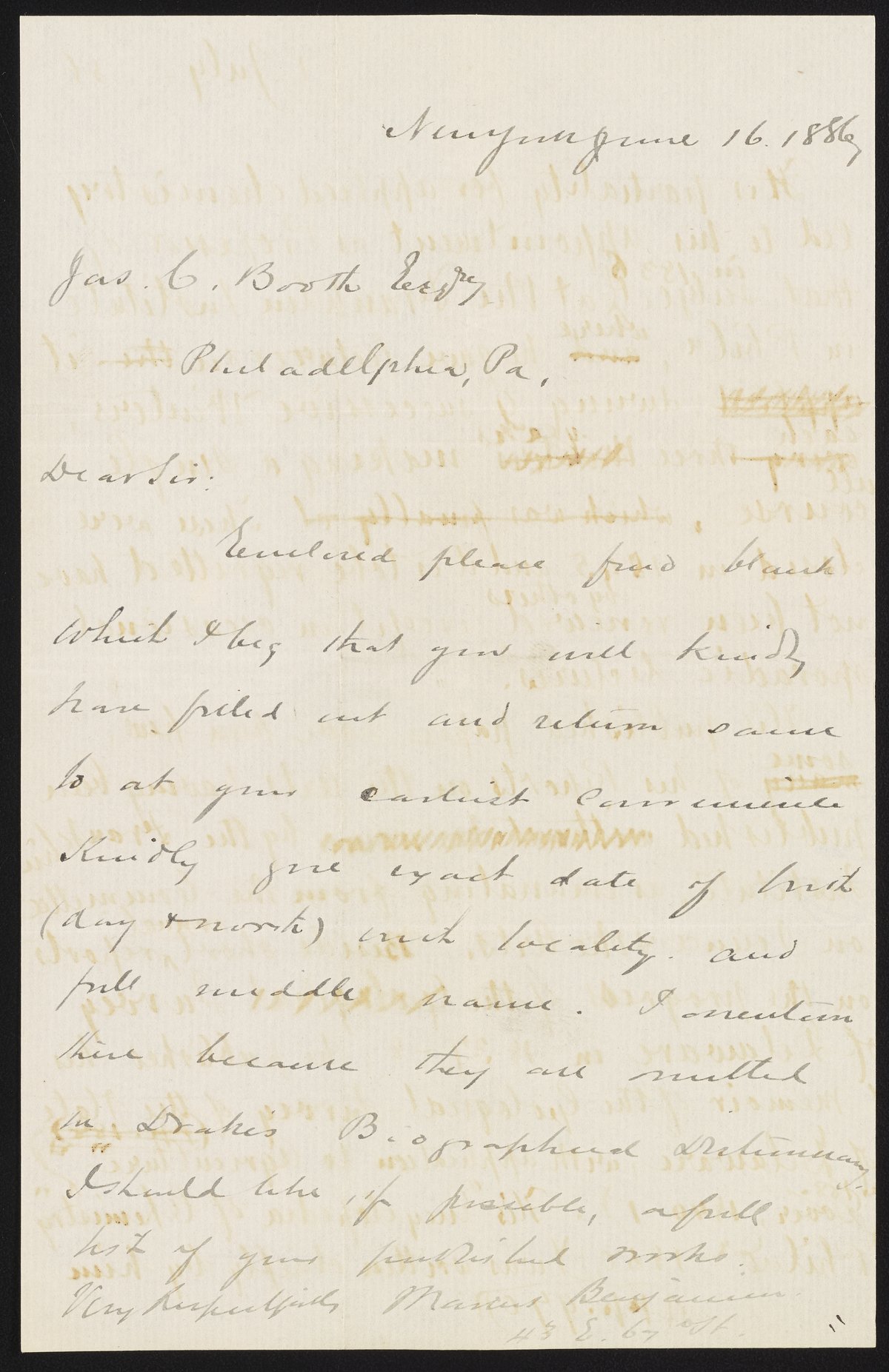 Letter from Marcus Benjamin to James Curtis Booth, June 16, 1886