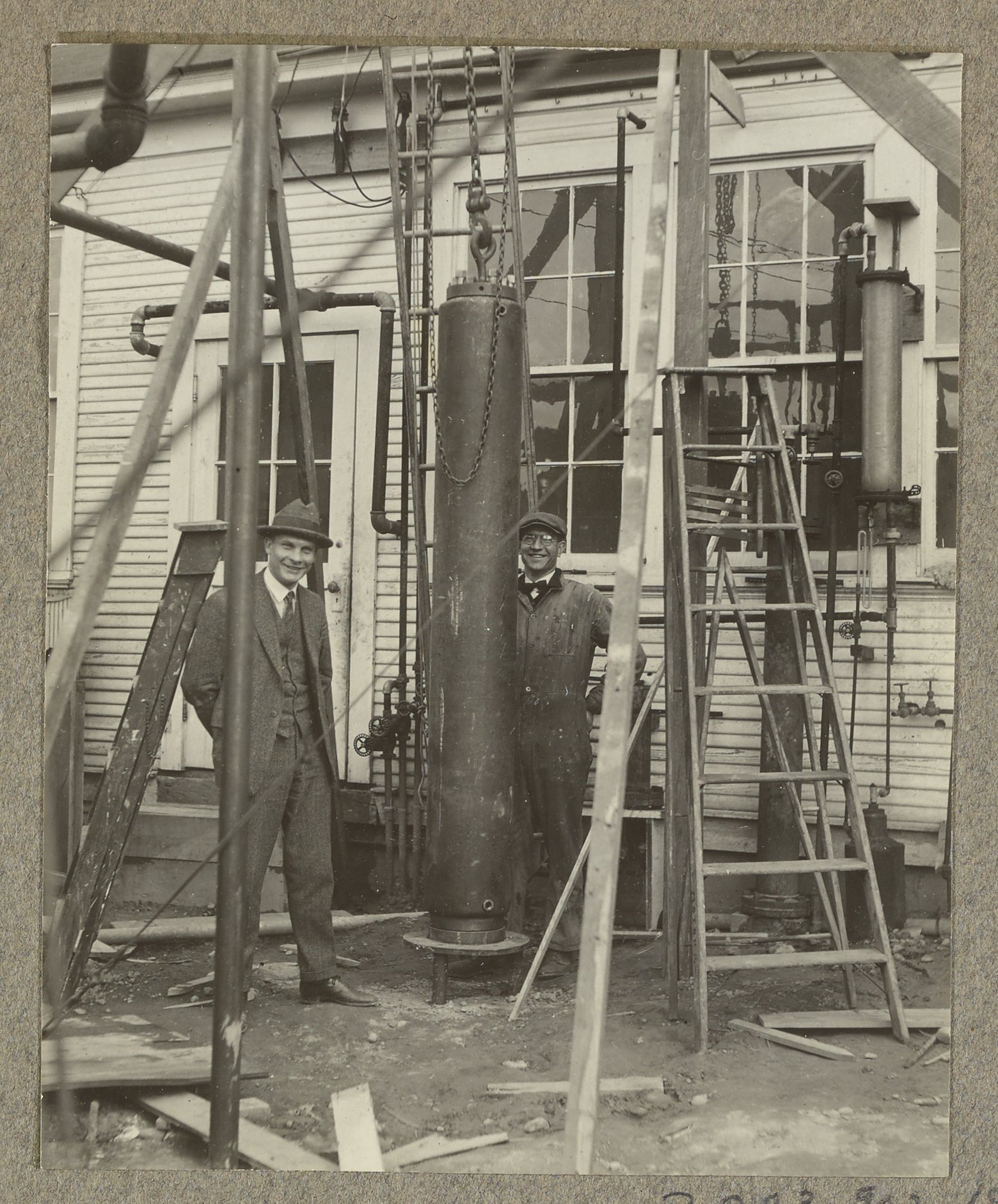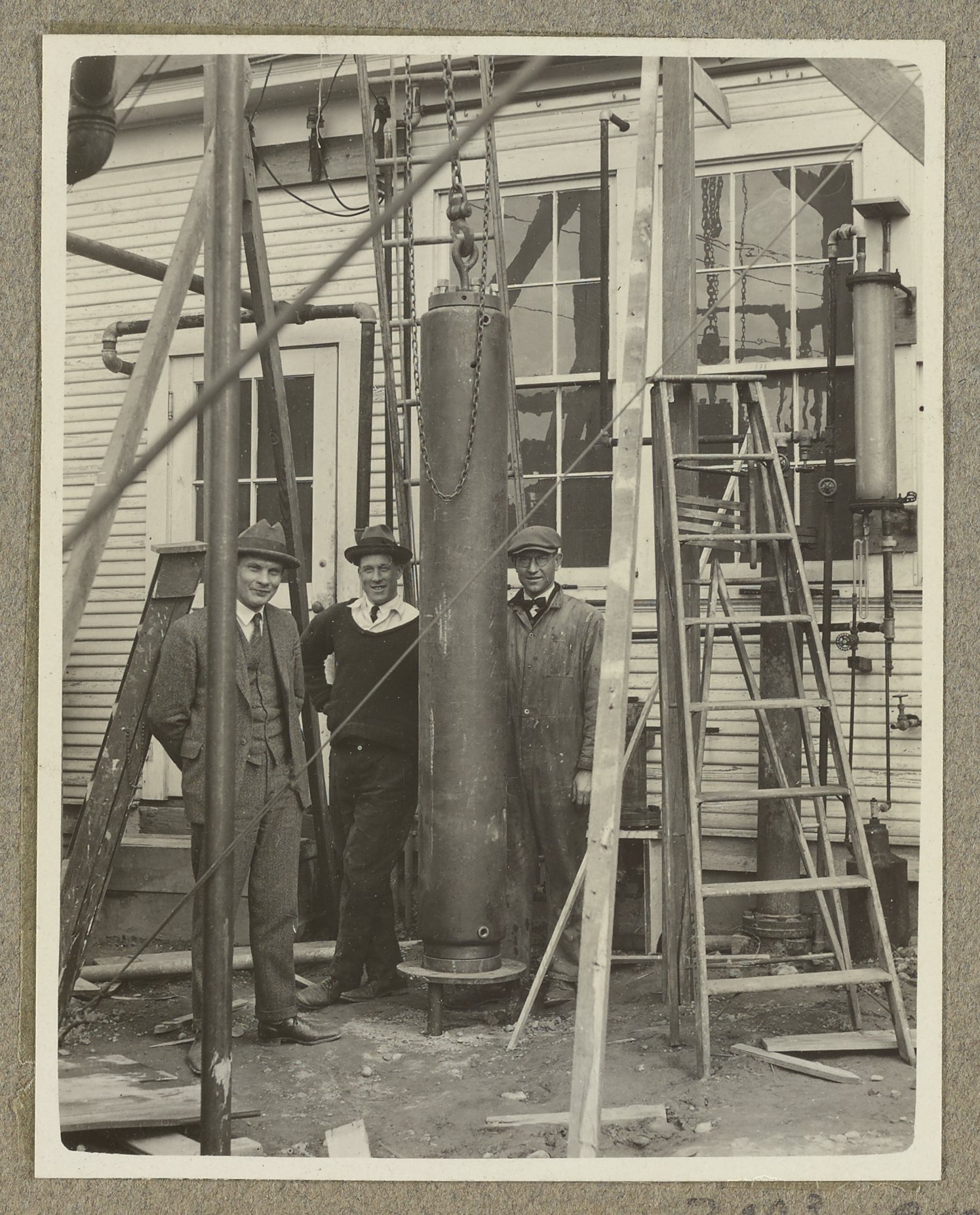 Small JPG1200 x 1448px — 352 KBFull-sized JPG1560 x 1882px — 536 KBOriginal fileTIFF — 1560 x 1882px — 8.5 MBTwo views of assorted apparatus at the Fixed Nitrogen Research Laboratory's Urea Plant. Urea is a water-soluble powder form of carbonic acid frequently used as a fertilizer and feed supplement. The individuals present in the photograph are identified, from left to right, as Mr. Krase, Mr. Weston, and Mr. Gaddy.