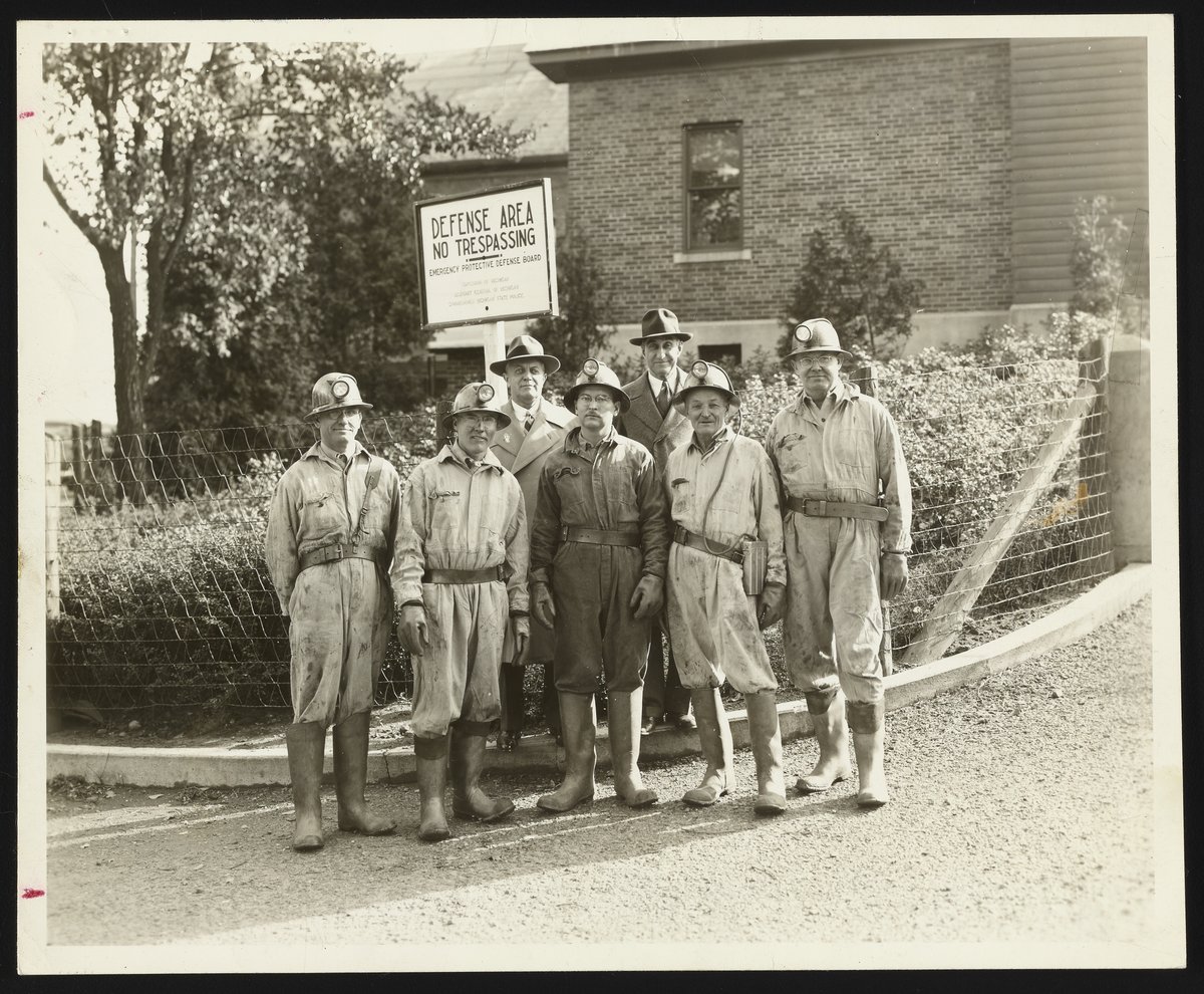Small JPG1200 x 990px — 280 KBLarge JPG2880 x 2376px — 1.2 MBFull-sized JPG4180 x 3449px — 2.1 MBOriginal fileTIFF — 4180 x 3449px — 41.3 MBGroup photograph of executives of the Cliffs Dow Chemical Company, a subsidiary of the Dow Chemical Company located in Marquette, Michigan. Several of the individuals are dressed in mining gear and the group is posed before a sign that reads "Defense Area - No Trespassing - Emergency Protective Defense Board." Per a caption in the December 1943 edition of the Dow Diamond, this photograph was taken following a visit to the Cliffs Dow iron ore mine.