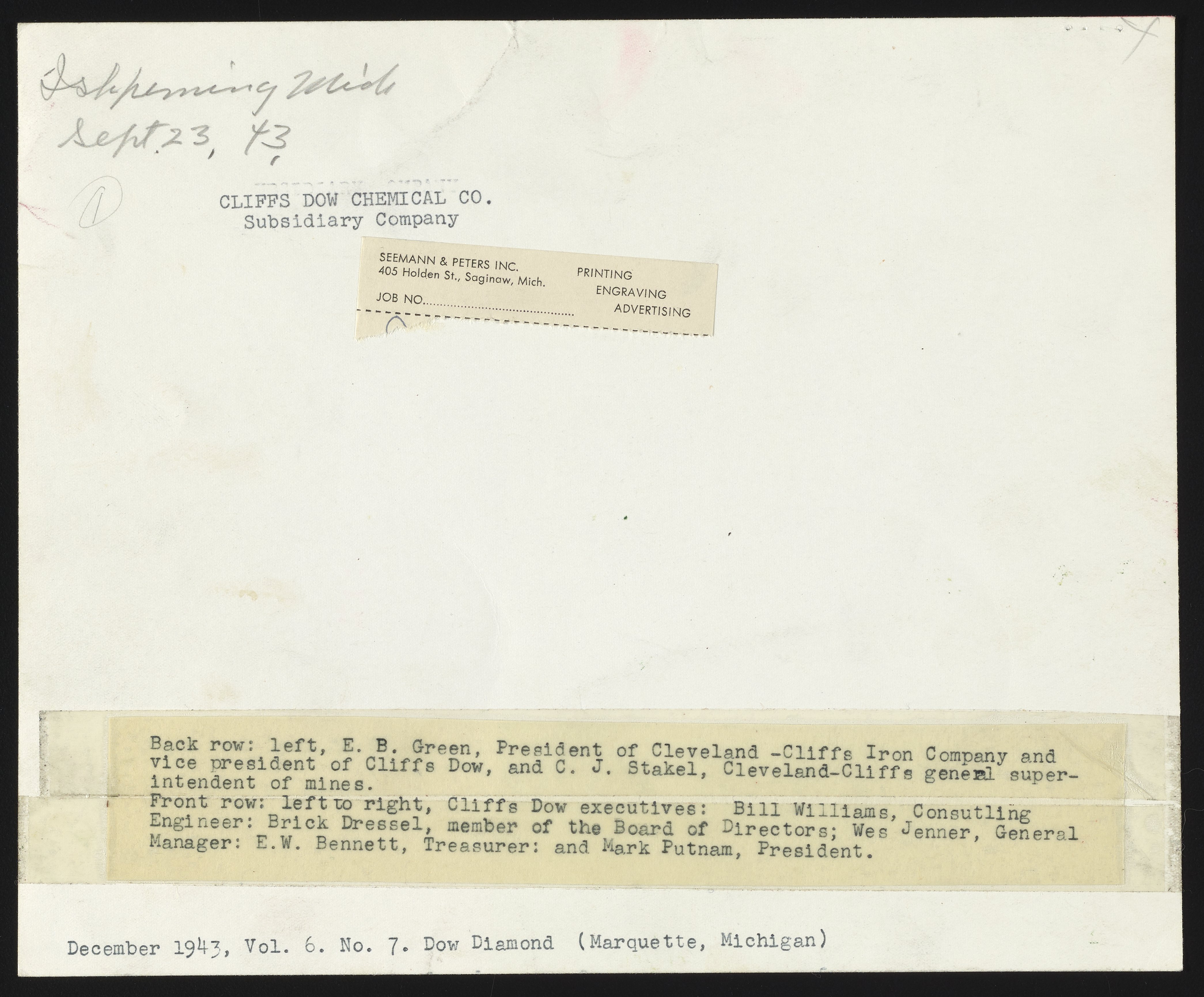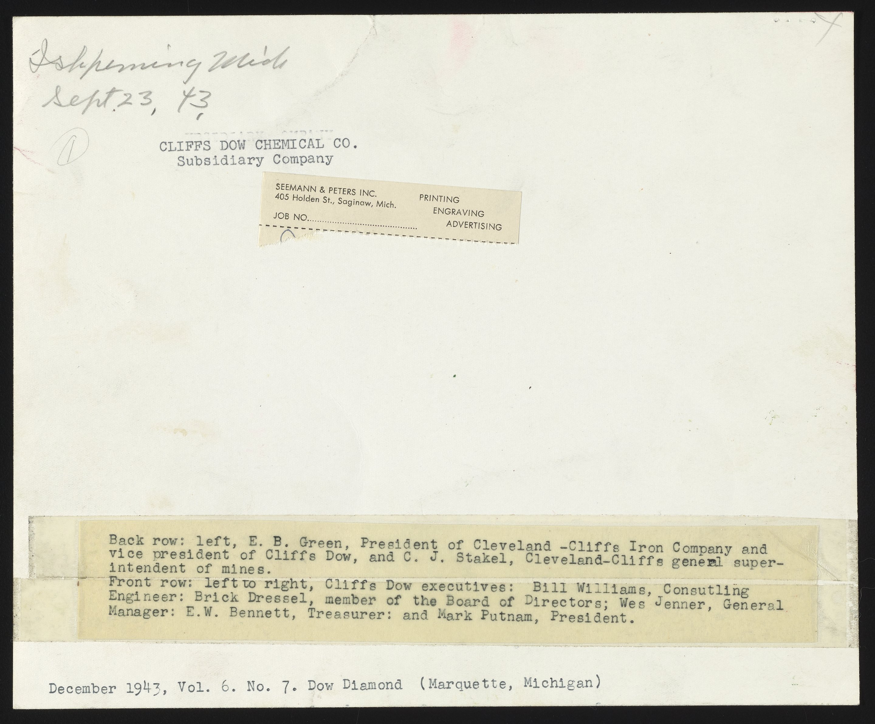 Dow Chemical Company. “Cliffs Dow Chemical Company Executives,” September 23, 1943. Dow Chemical Company Historical Image Collection, Box 2, Folder Places--Cliffs Dow Chemical Company--Exterior Plant Views. Science History Institute. Philadelphia. https://digital.sciencehistory.org/works/p8418n85d.