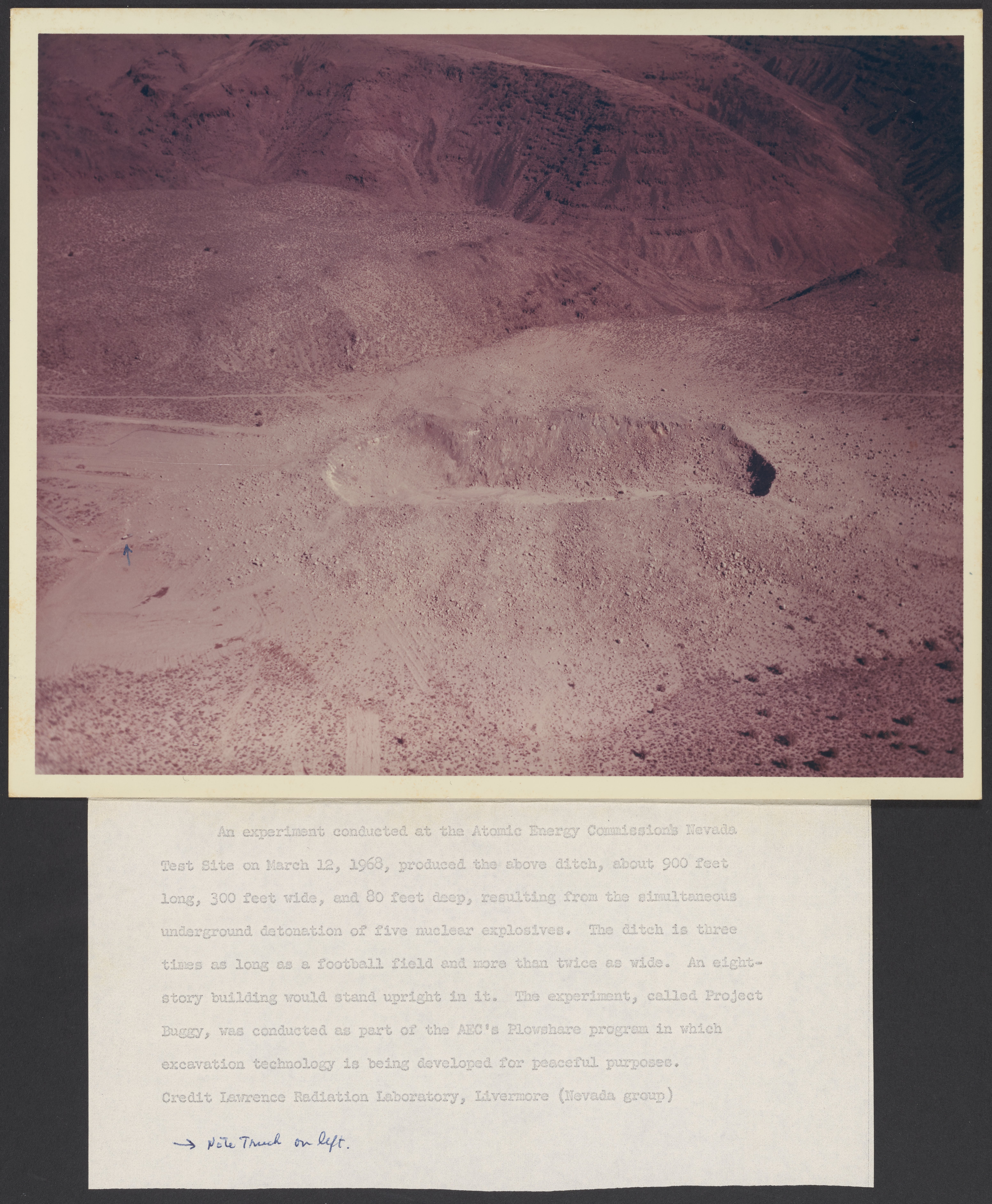 Small JPG1200 x 1457px — 295 KBLarge JPG2880 x 3496px — 1.5 MBFull-sized JPG6203 x 7529px — 5.8 MBOriginal fileTIFF — 6203 x 7529px — 134 MBPhotograph of a ditch created by a test explosion at the Atomic Energy Commission's Nevada Test Site on March 12, 1968. The test was conducted as part of the Gasbuggy (erroneously identified as "Project Buggy" in the caption accompanying the photograph.)