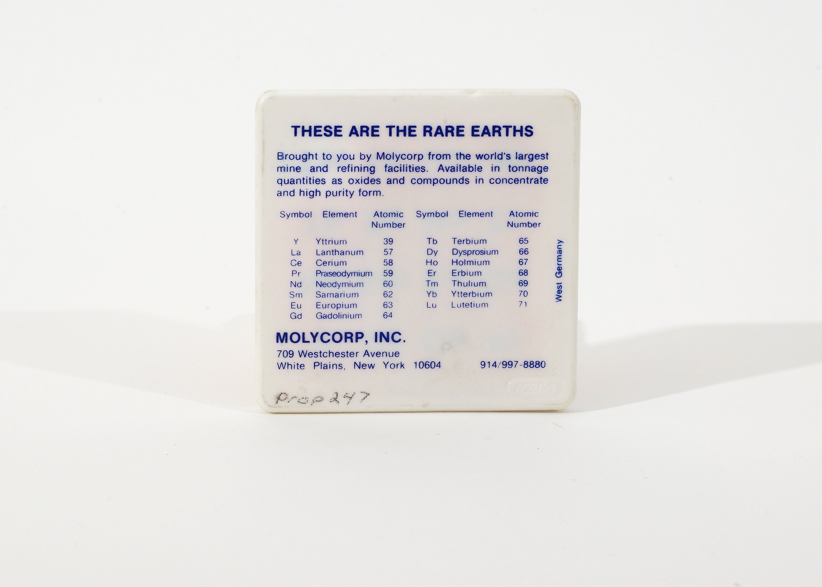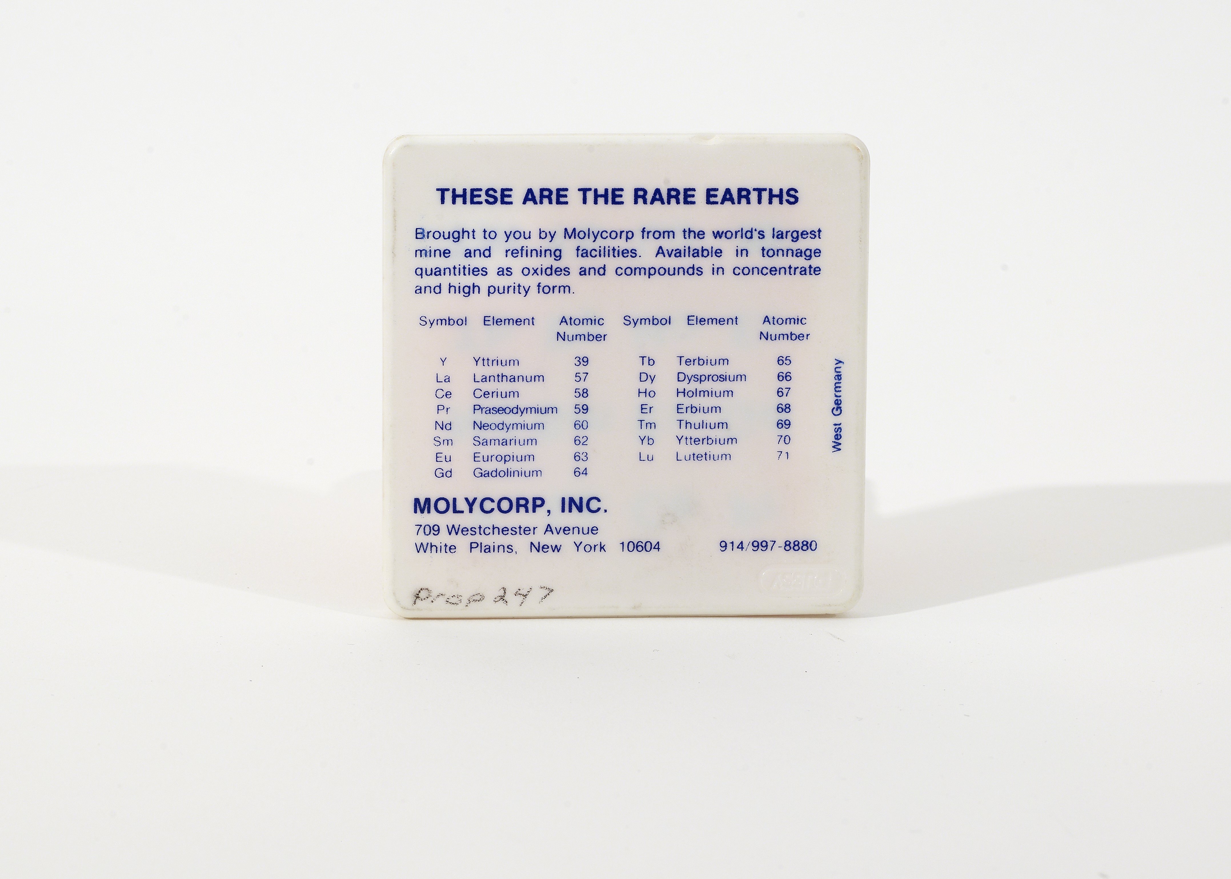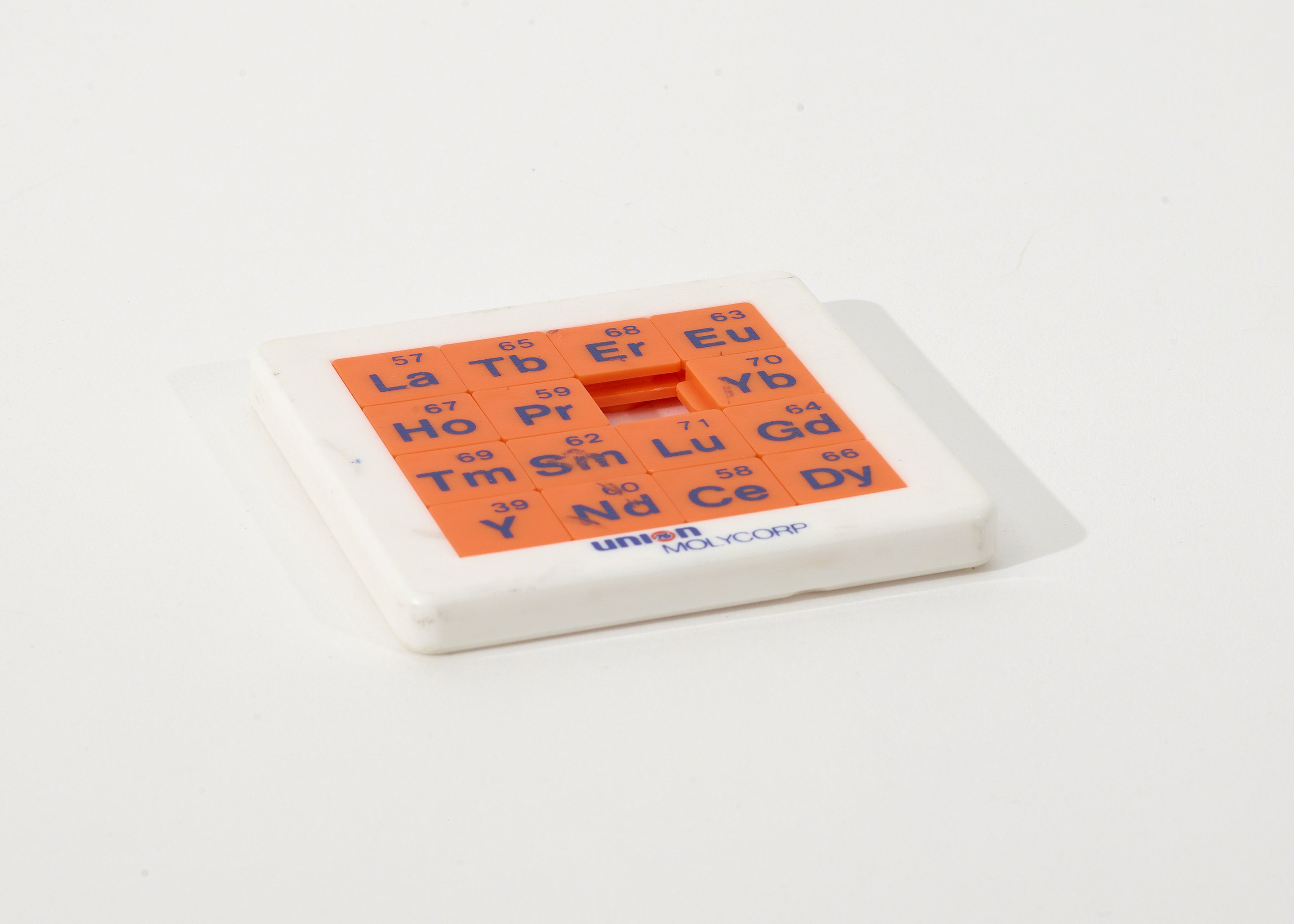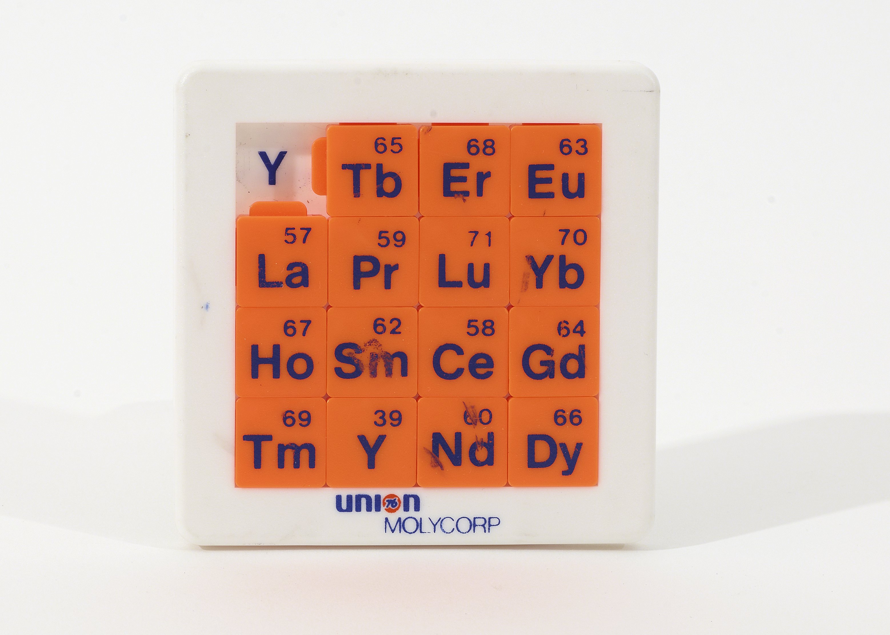 Small JPG1200 x 857px — 88.5 KBLarge JPG2880 x 2056px — 472 KBFull-sized JPG3115 x 2224px — 563 KBOriginal fileTIFF — 3115 x 2224px — 19.8 MBSquare slide puzzle with white frame and 15 orange sliding pieces. Sliding pieces have the chemical symbols for the rare earth elements printed on them. Printed on bottom edge of frame is "Union Molycorp."