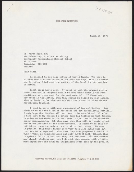 Crick, Francis. “Letter from Francis Crick to Aaron Klug, March 30, 1977,” March 30, 1977. History of Molecular Biology Collection, Box 19, Folder 26. Science History Institute. Philadelphia. https://digital.sciencehistory.org/works/p8imcll.