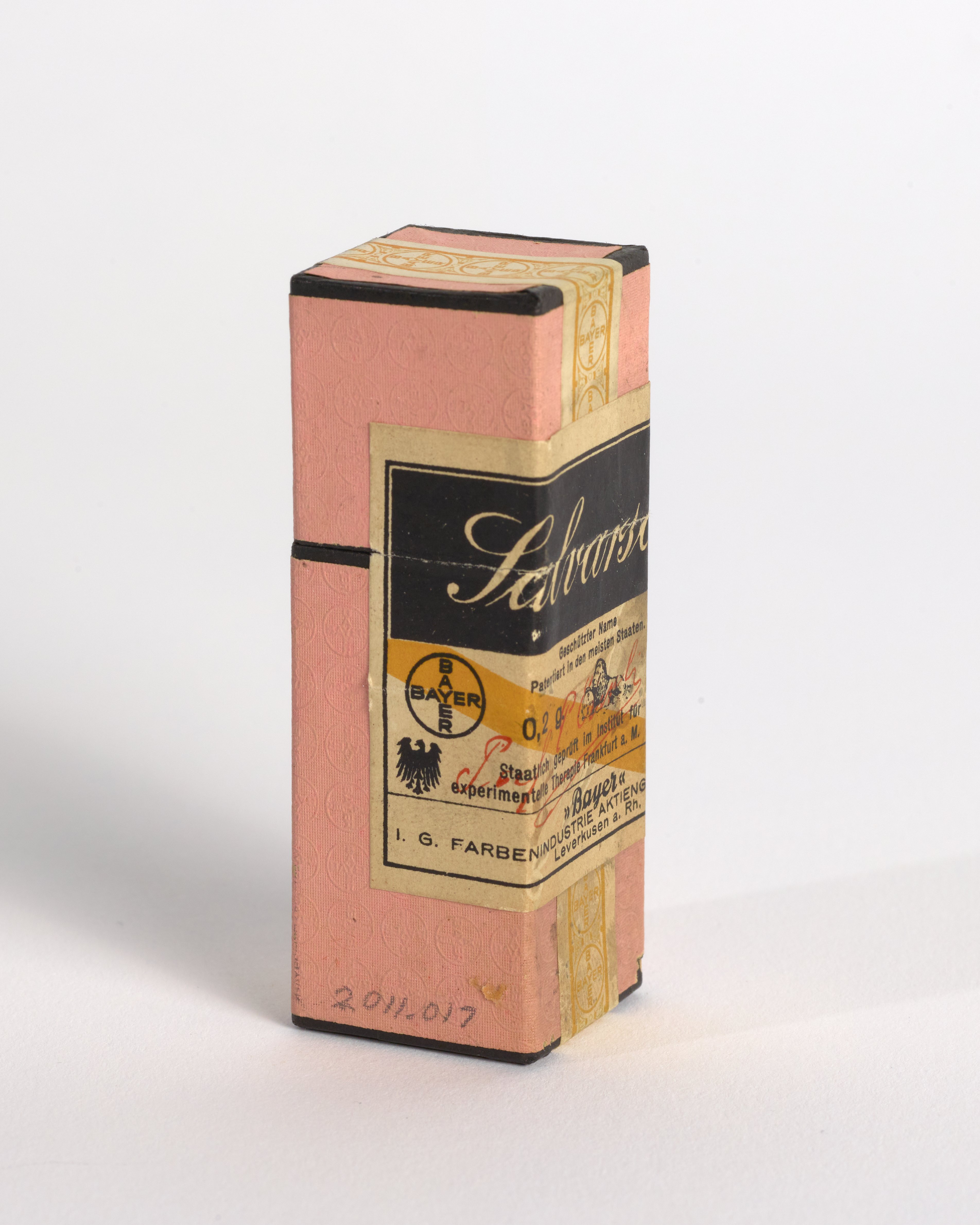 Small JPG1200 x 1500px — 150 KBLarge JPG2880 x 3600px — 704 KBFull-sized JPG6870 x 8588px — 3.5 MBOriginal fileTIFF — 6870 x 8588px — 338 MBSmall pink cardboard box with paper label that reads "Salvarsan" in cursive letters in white text on black background. Inside the box is a small glass vial containing a medicine sample, a small blade, and an information pamphlet written in German.