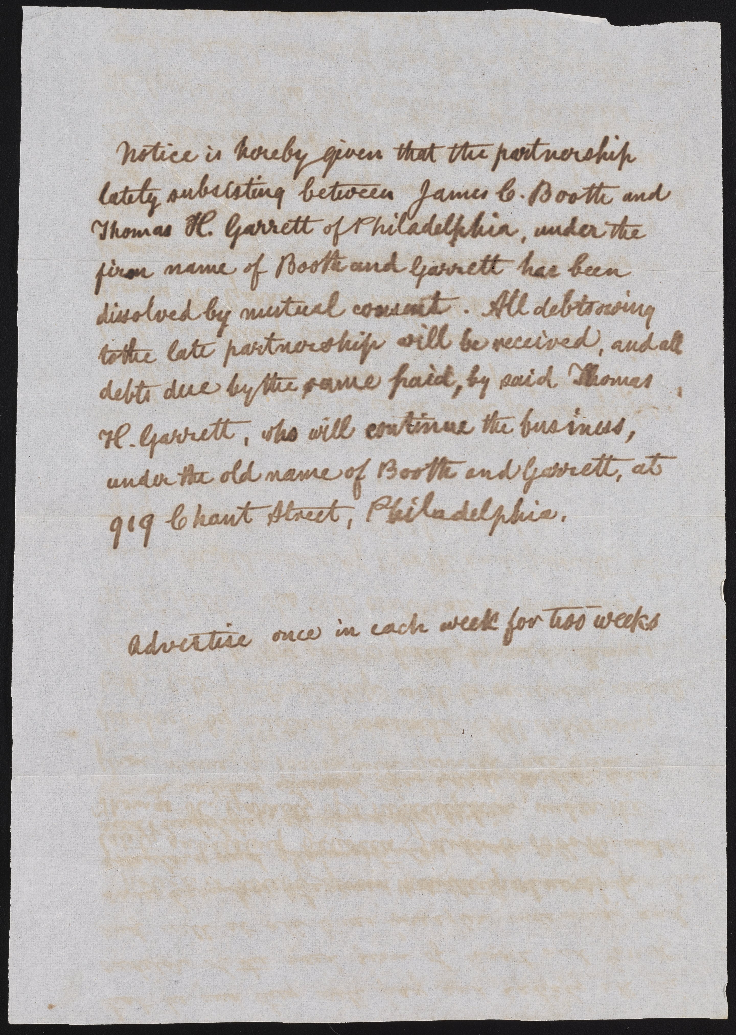 Advertisement of the dissolution of James Curtis Booth and Thomas H. Garrett