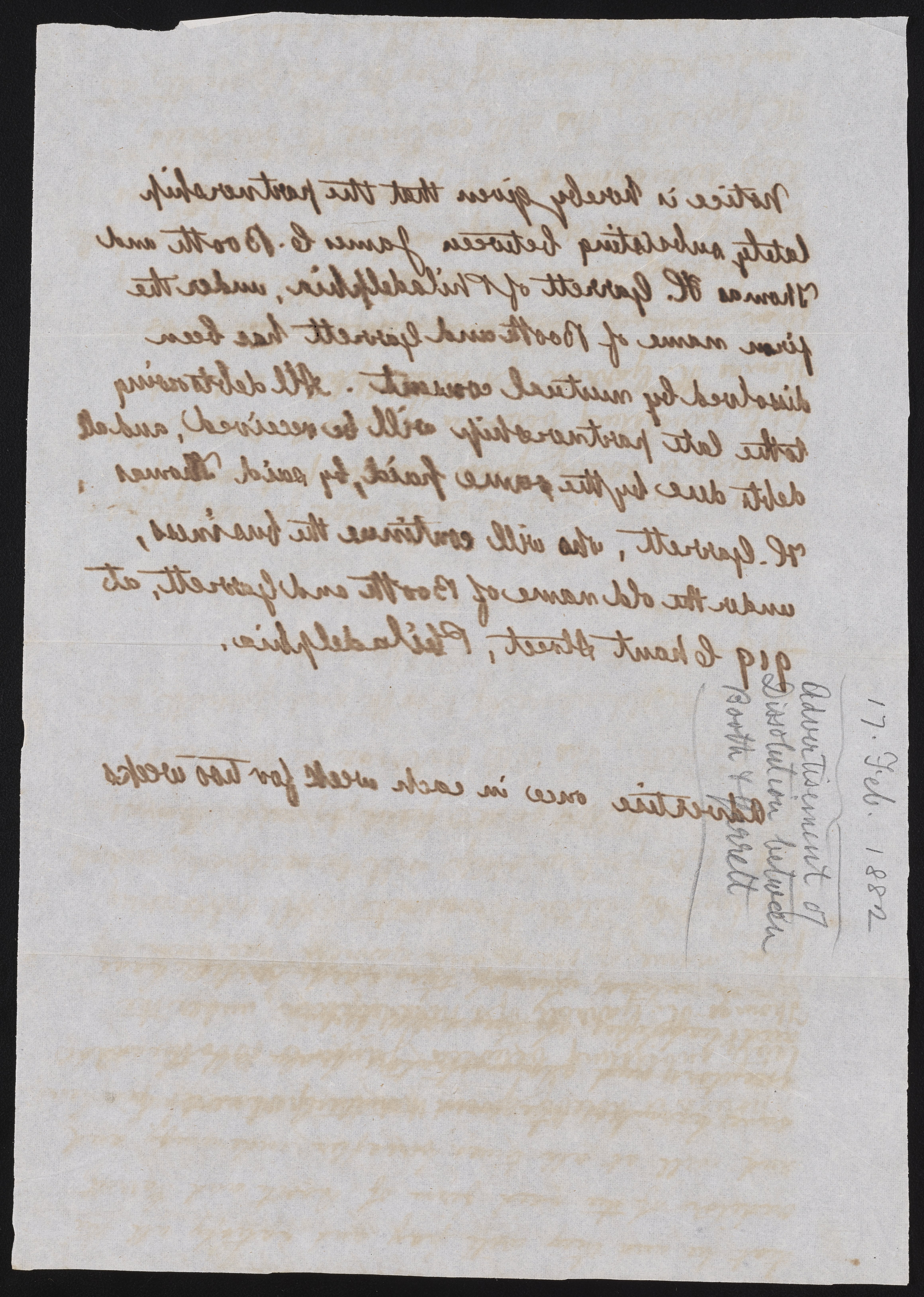 Advertisement of the dissolution of James Curtis Booth and Thomas H. Garrett