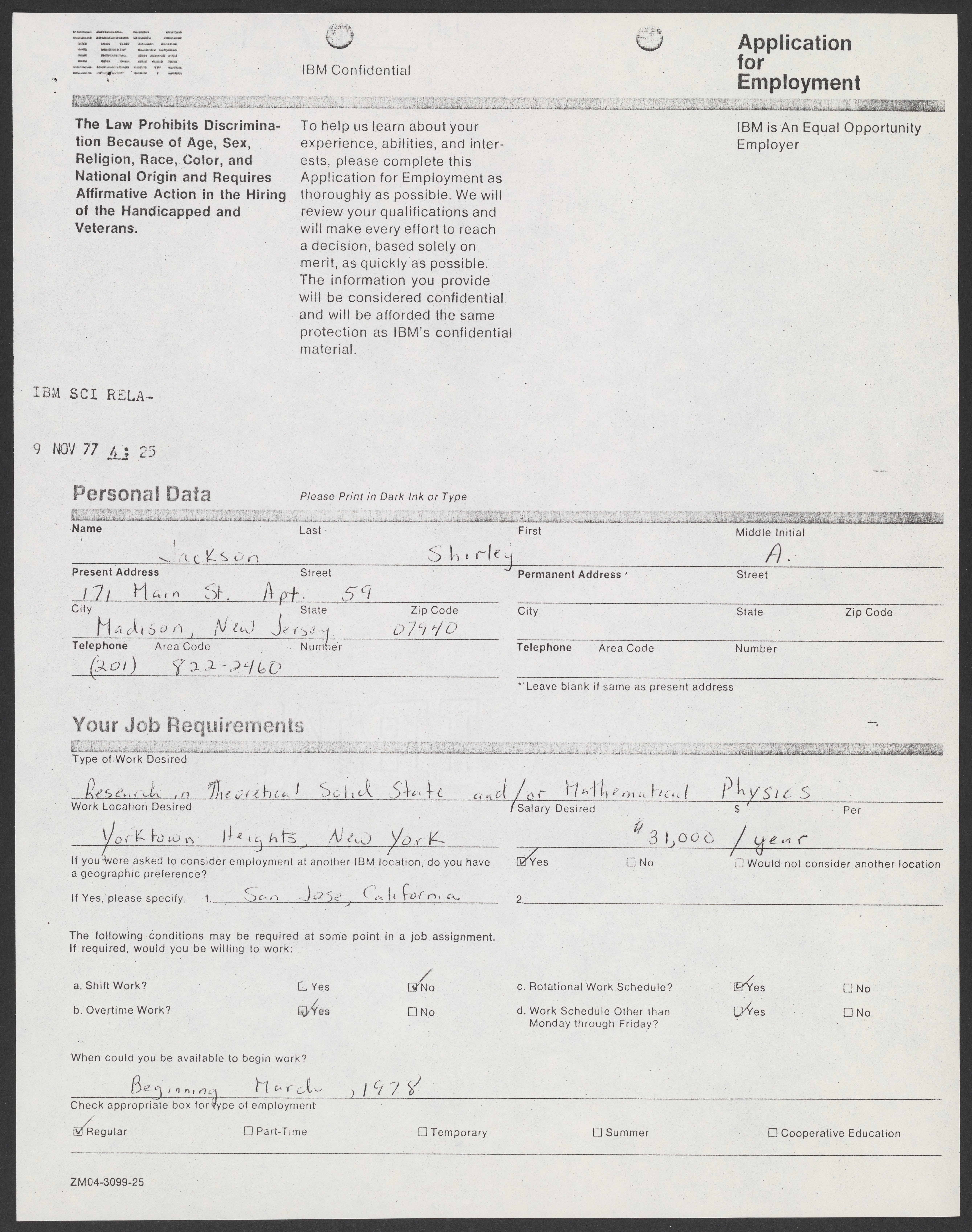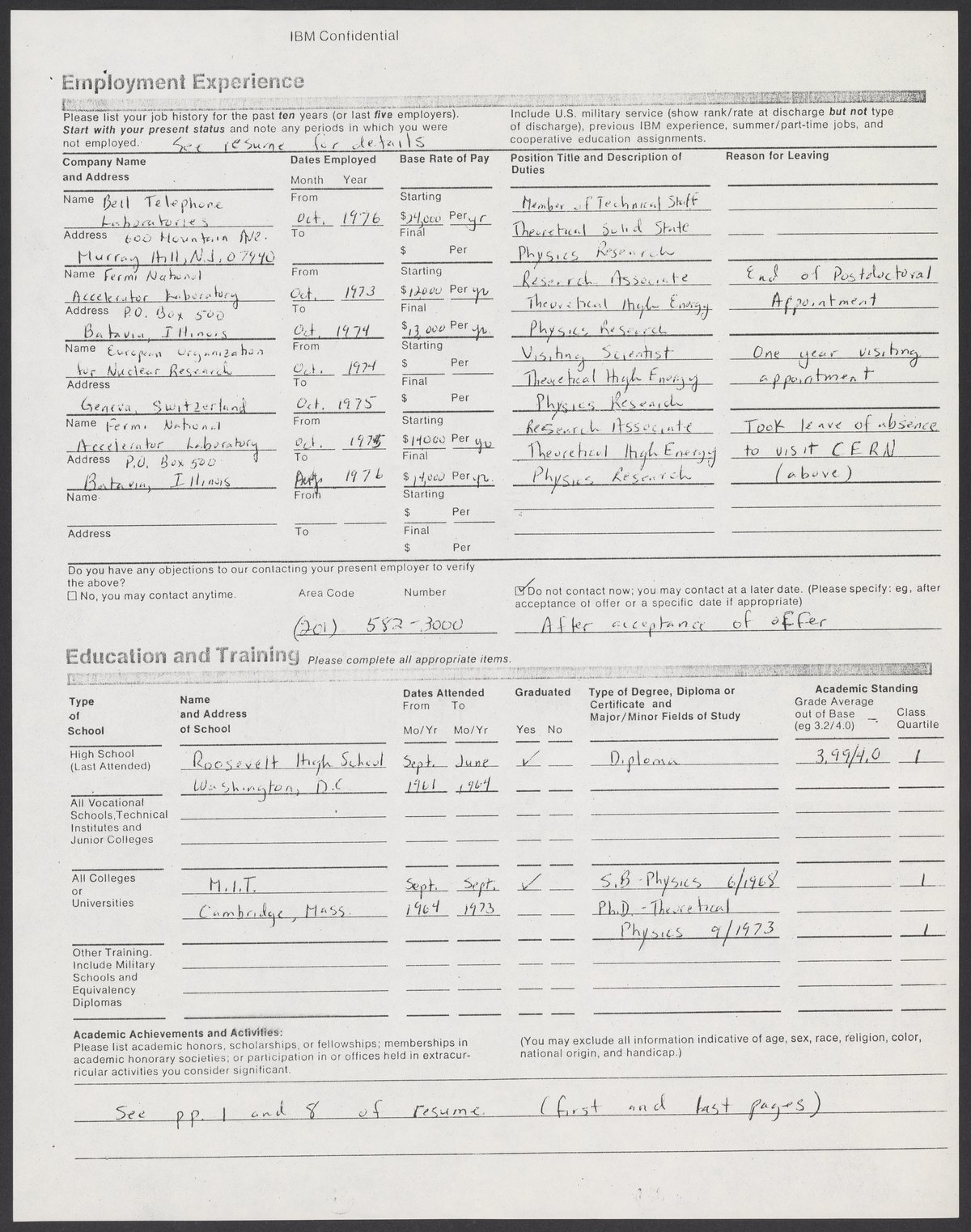 Shirley Ann Jackson's application for employment at IBM