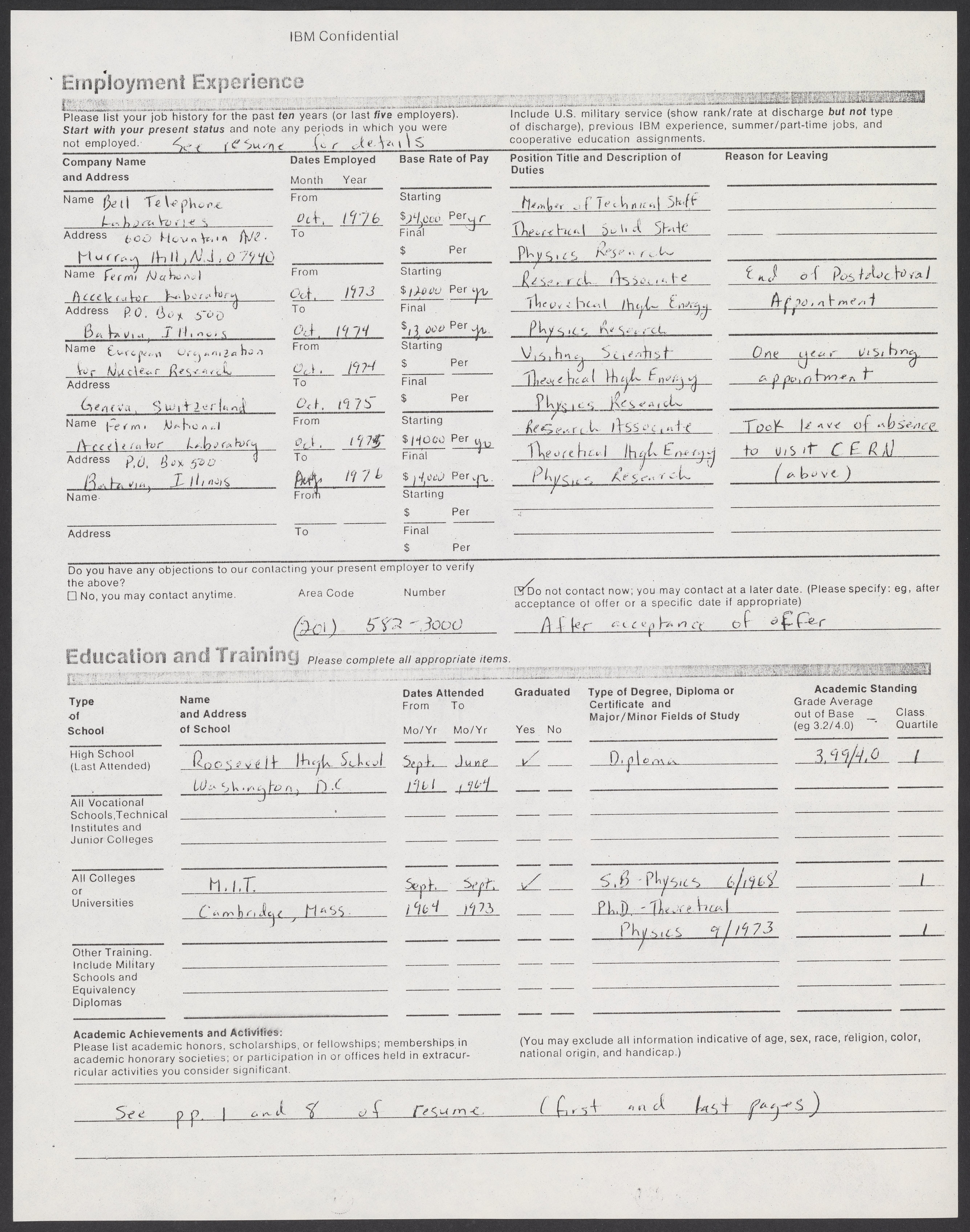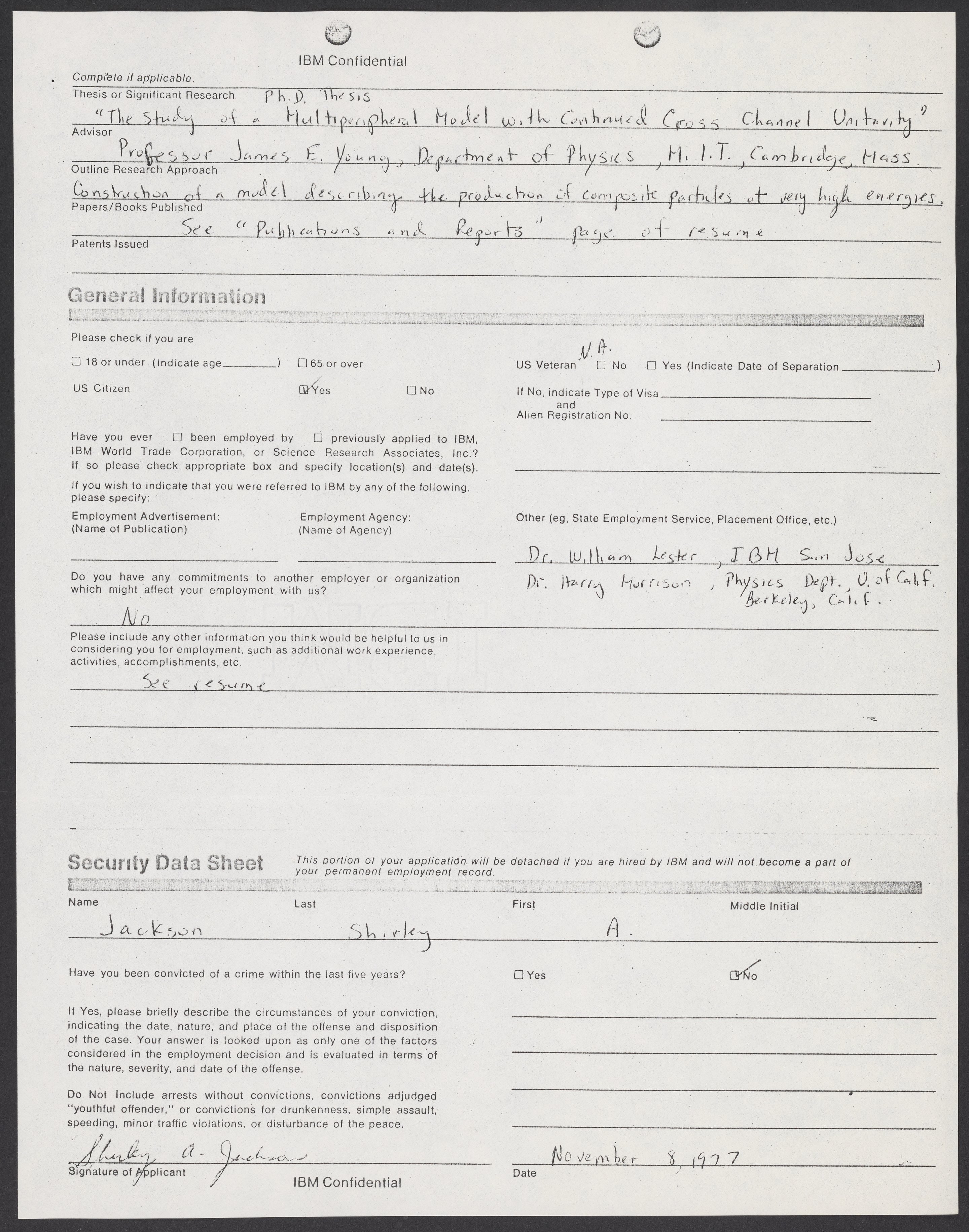 Shirley Ann Jackson's application for employment at IBM