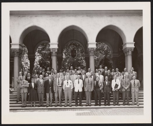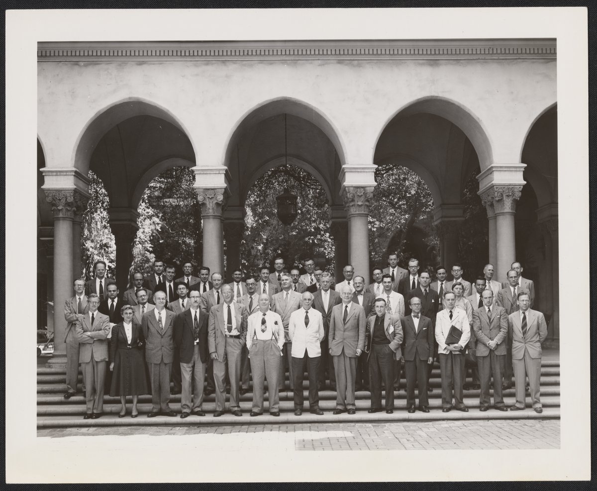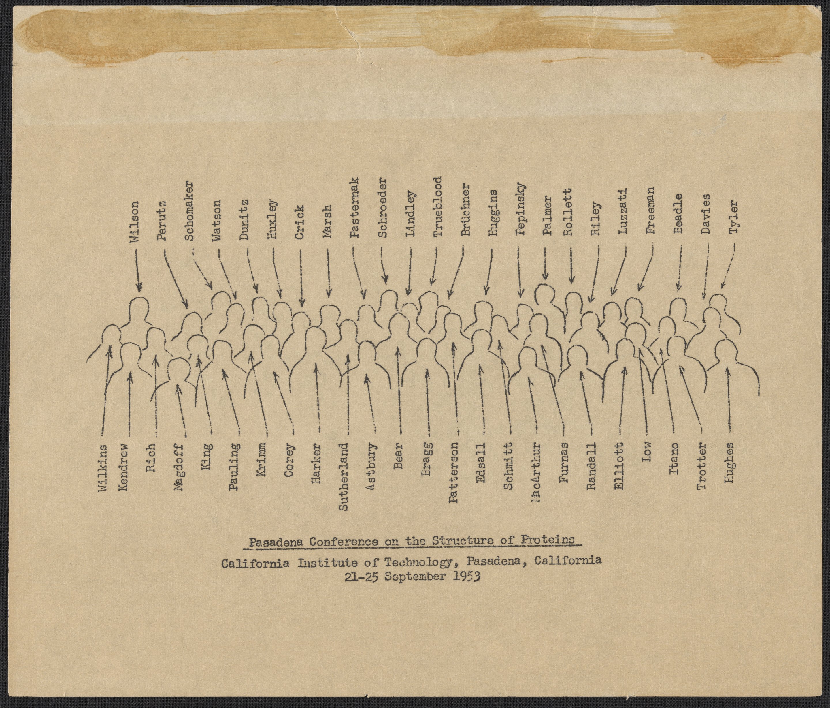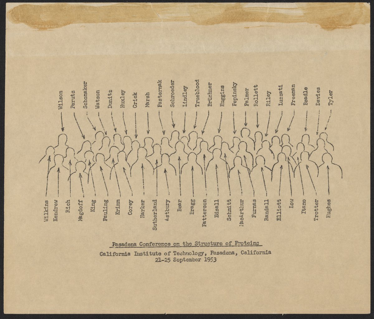 “Group Photograph at the Pasadena Conference on the Structure of Proteins, 1953,” 1953. History of Molecular Biology Collection, Box 83, Folder 7. Science History Institute. Philadelphia. https://digital.sciencehistory.org/works/pao186w.