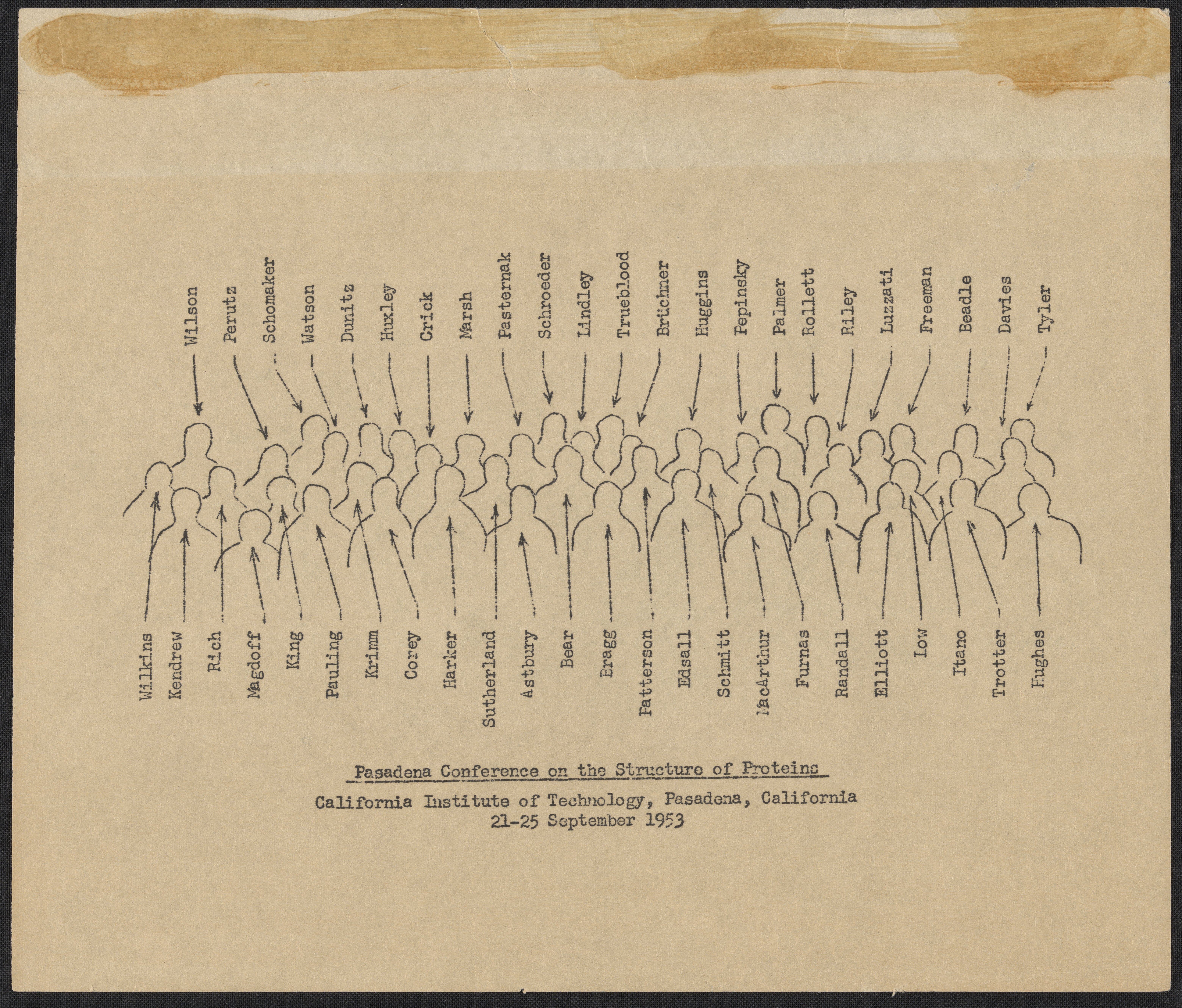 “Group Photograph at the Pasadena Conference on the Structure of Proteins, 1953,” 1953. History of Molecular Biology Collection, Box 83, Folder 7. Science History Institute. Philadelphia. https://digital.sciencehistory.org/works/pao186w.