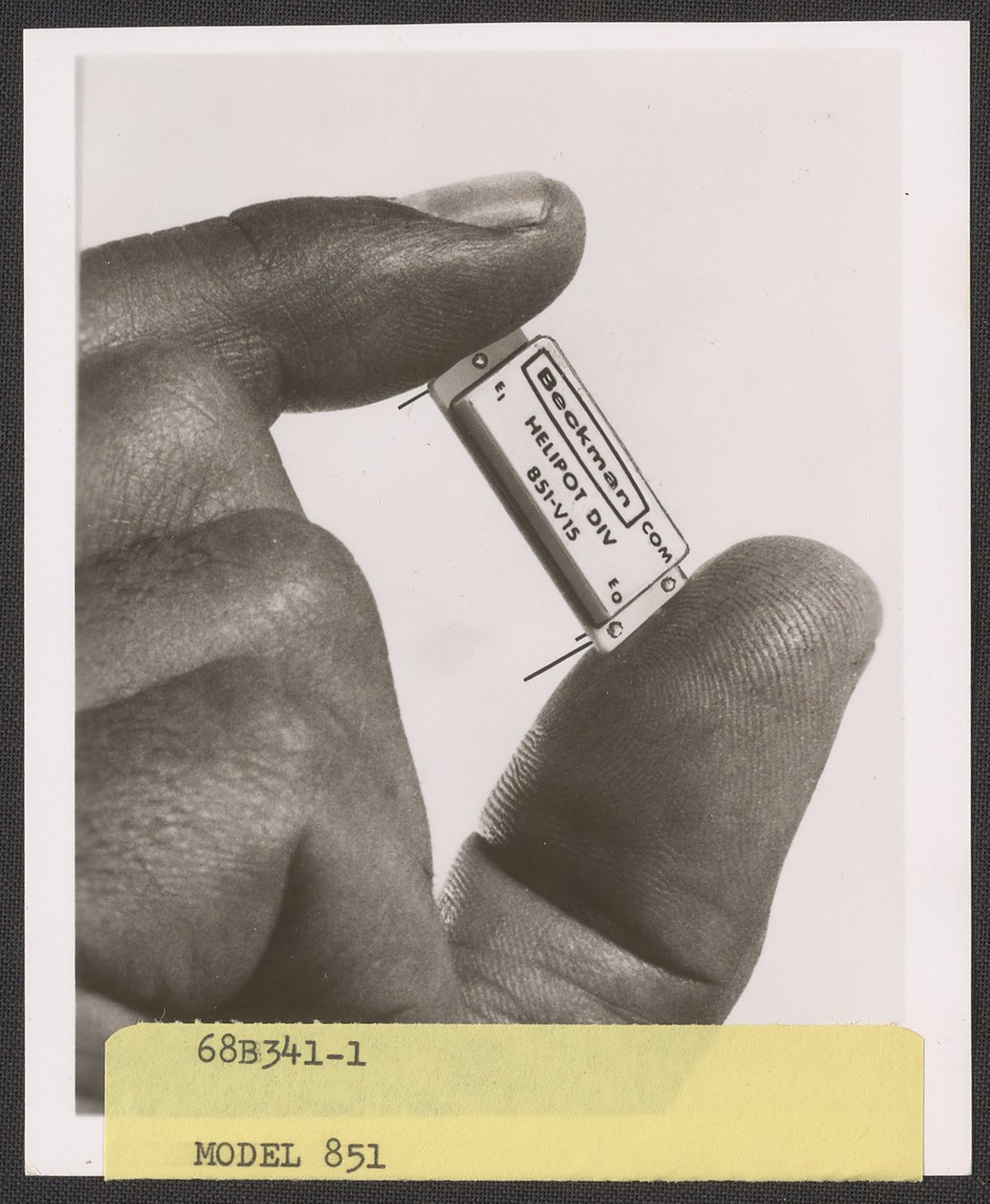 “Hand Holding a Helipot Model 851 Voltage Regulator,” 1950–1969. Beckman Historical Collection, Box 85. Science History Institute. Philadelphia. https://digital.sciencehistory.org/works/pc289j35q.