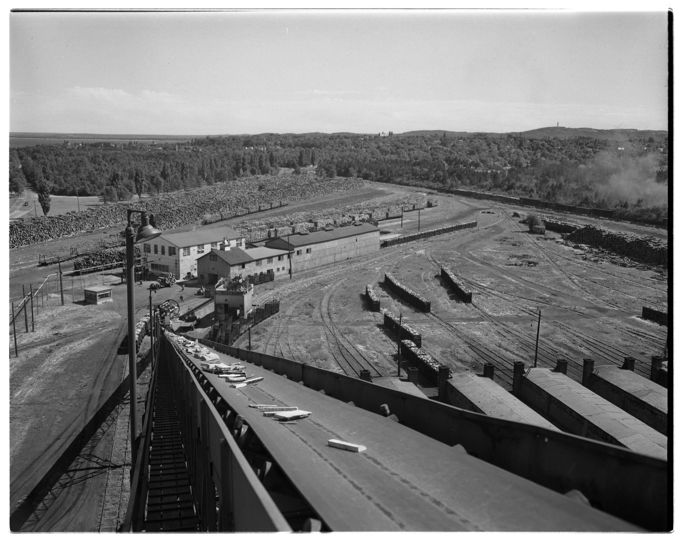 Elevated view of the sawmill at the Cliffs Dow wood distillation plant located in Marquette, Michigan taken from the perspective of the vertical retort, with view of wood storage in background. Seeking a source of raw material for its new plastic, ethylcellulose, the Dow Chemical Company joined with the Cleveland-Cliffs Iron Company to form the Cliffs Dow Chemical Company in April 1935. The Cliffs Dow plant in Marquette primarily produced charcoal used in the manufacture of pig iron, as well as a range of chemical by-products including acetic acid, calcium acetate, wood alcohol, and ethyl alcohol. Notably, when the Marquette plant ceased operations in 1969, it was the last wood distillation plant in the United States.