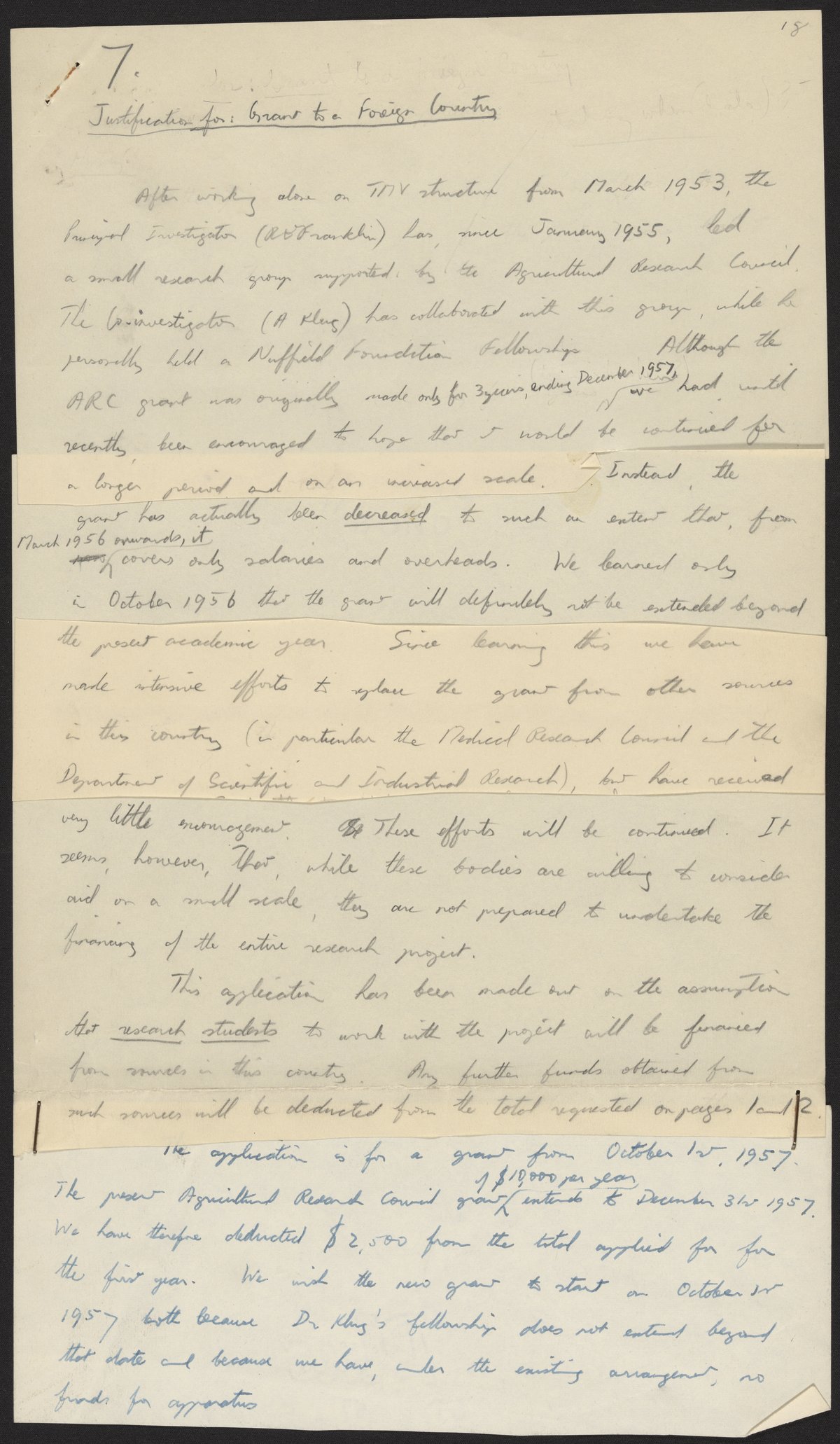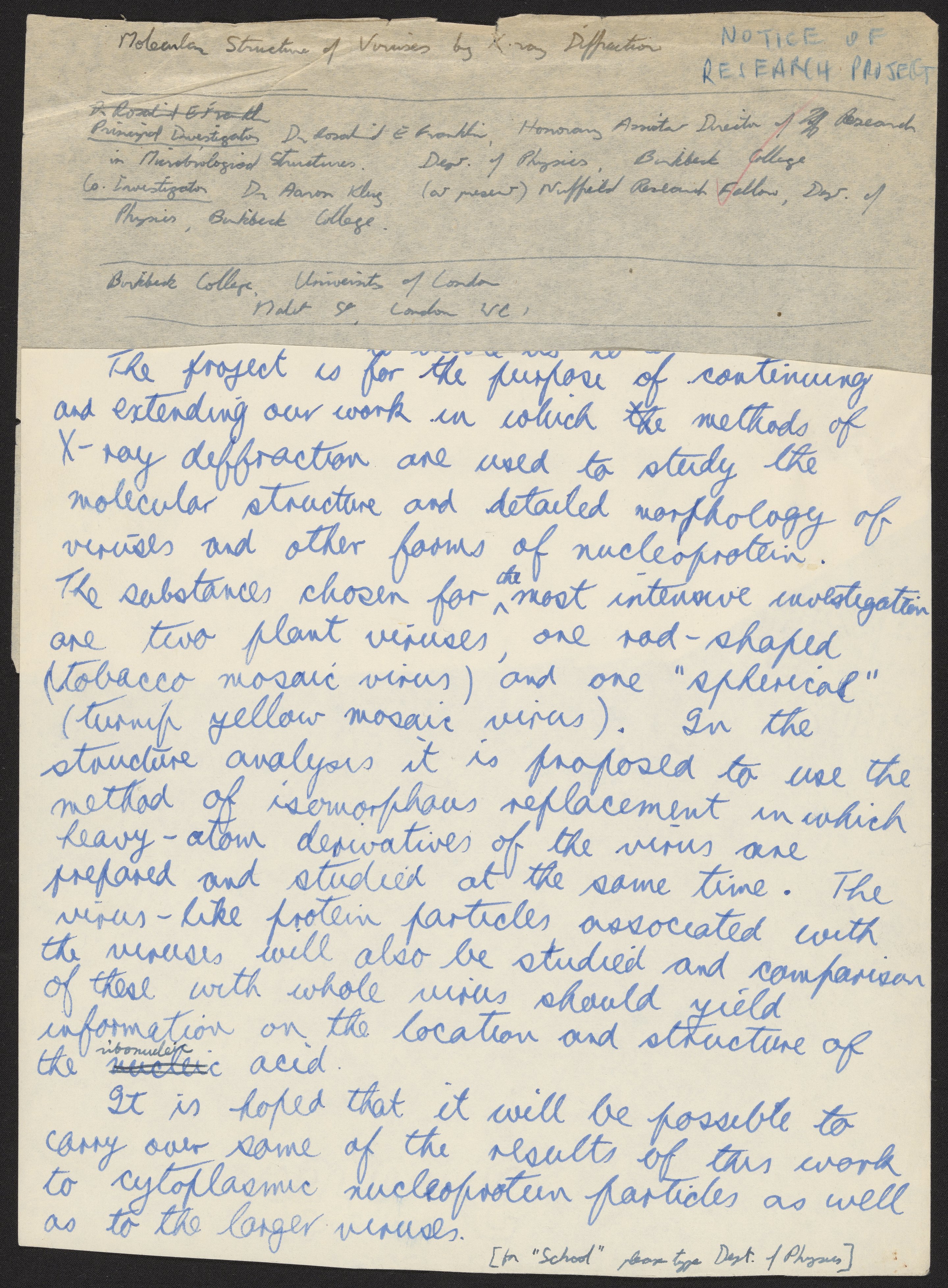 Franklin, Rosalind. “Notes for a Grant Application to the National Institutes of Health,” 1956. History of Molecular Biology Collection, Box 10, Folder 6. Science History Institute. Philadelphia. https://digital.sciencehistory.org/works/peeweb3.