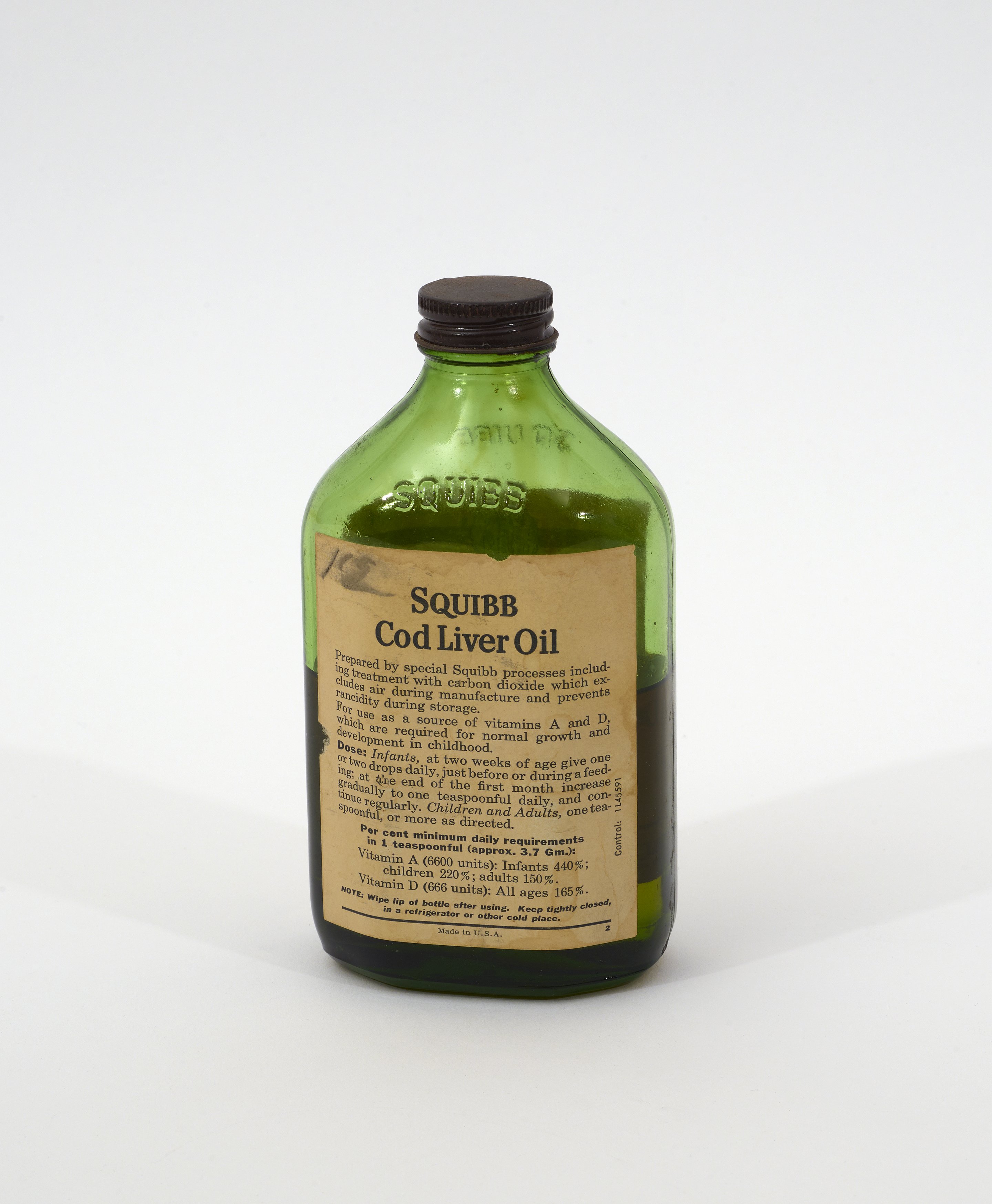 12 fl. oz bottle of Squibb Mint Flavored Cod Liver Oil. The back label explains that this cod liver oil is treated with carbon dioxide which extends its shelf life. Additionally, the label includes dosage and storage instructions.