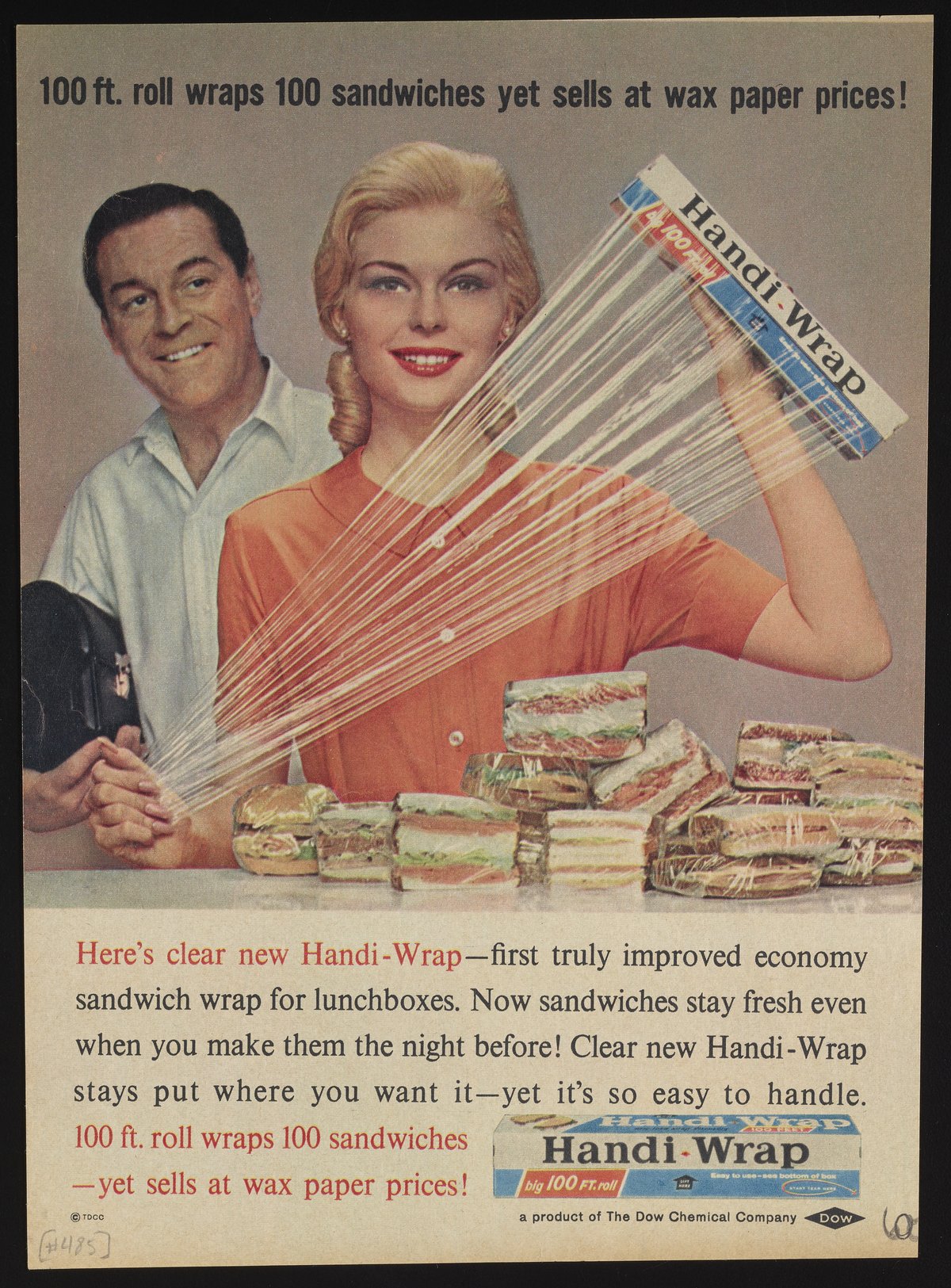 Dow Chemical Company. “100 Ft. Roll Wraps 100 Sandwiches Yet Sells at Wax Paper Prices!,” 1960. Advertisements from the Dow Chemical Historical Collection, Box 8. Science History Institute. Philadelphia. https://digital.sciencehistory.org/works/pfo6a23.