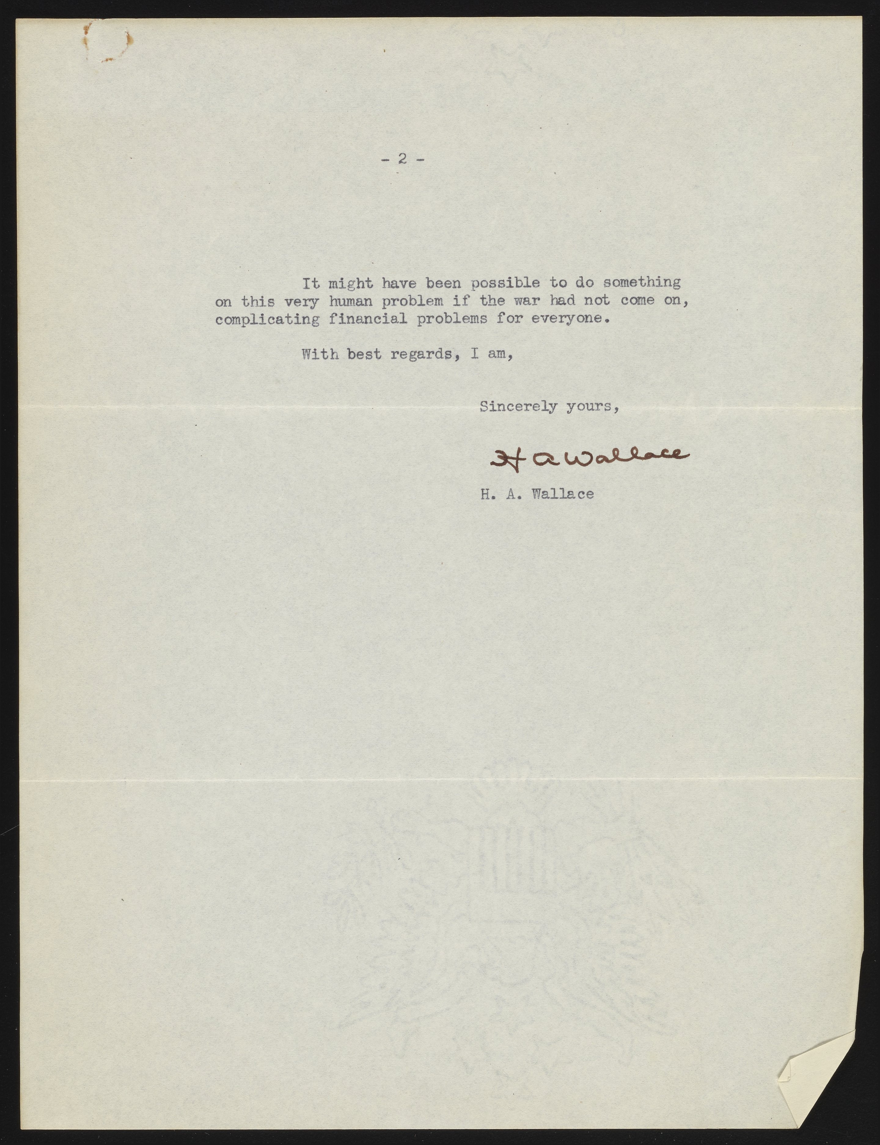 Small JPG1200 x 1550px — 308 KBLarge JPG2880 x 3719px — 1.8 MBFull-sized JPG3460 x 4468px — 2.5 MBOriginal fileTIFF — 3460 x 4468px — 44.3 MBLetter from Henry A. Wallace, Vice President of the United States, to microbiologist and author Paul de Kruif. The letter concerns corn genetics research conducted by plant geneticist, George Harrison Shull, at Princeton University. Shull was a subject in de Kruif's 1928 book, Hunger Fighters, and sent a letter to de Kruif, which was forwarded to Vice President Wallace, concerning the fate of Shull's genetic plant material once he retired.