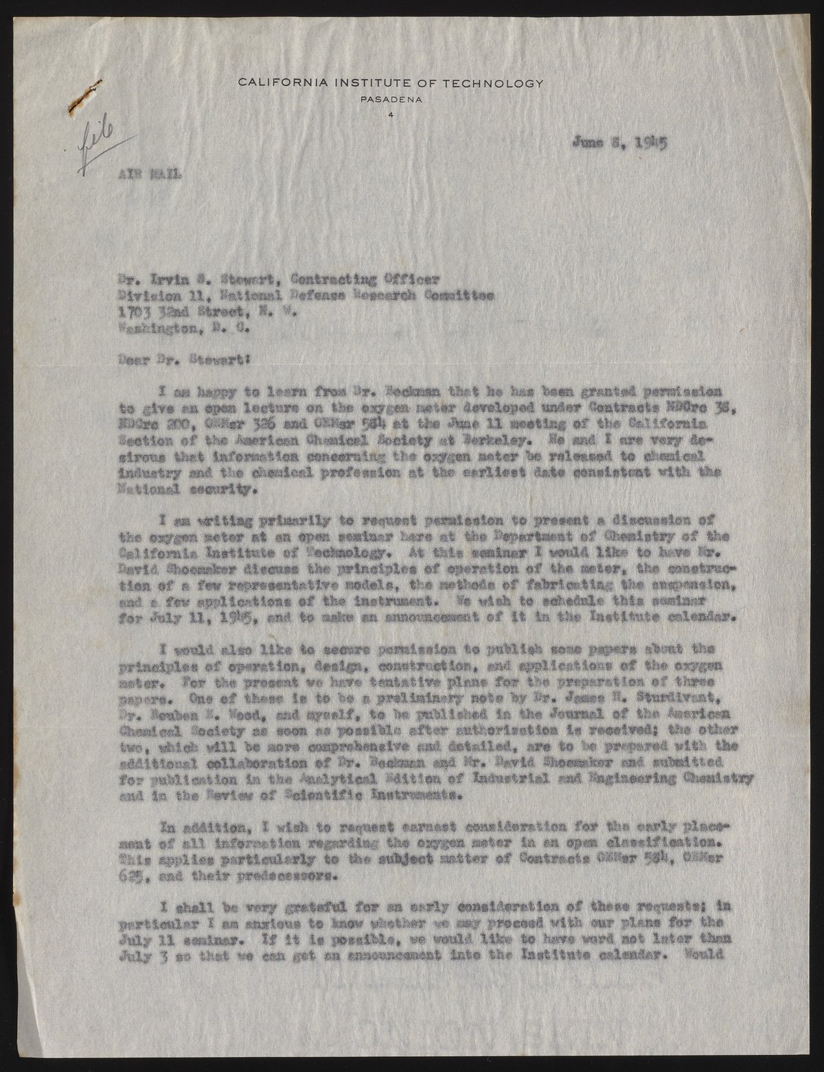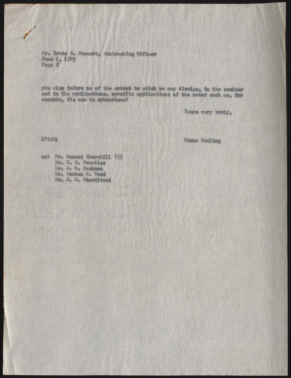 Letter from Linus Pauling to Irvin S. Stewart