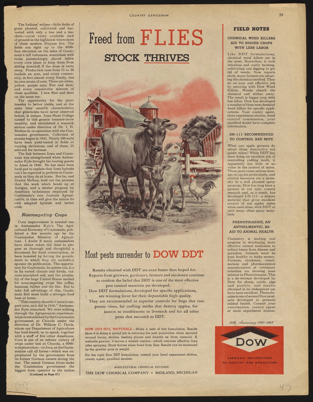 Color print advertisement for DDT manufactured and sold by the Dow Chemical Company for pest control around barns and stables, as well as direct application to livestock. The advertisement features an illustration of a farm yard with view of a barn and several types of animals, including chickens, horses, and cows. This advertisement appeared on page 59 of the June 1947 edition of Country Gentleman.
