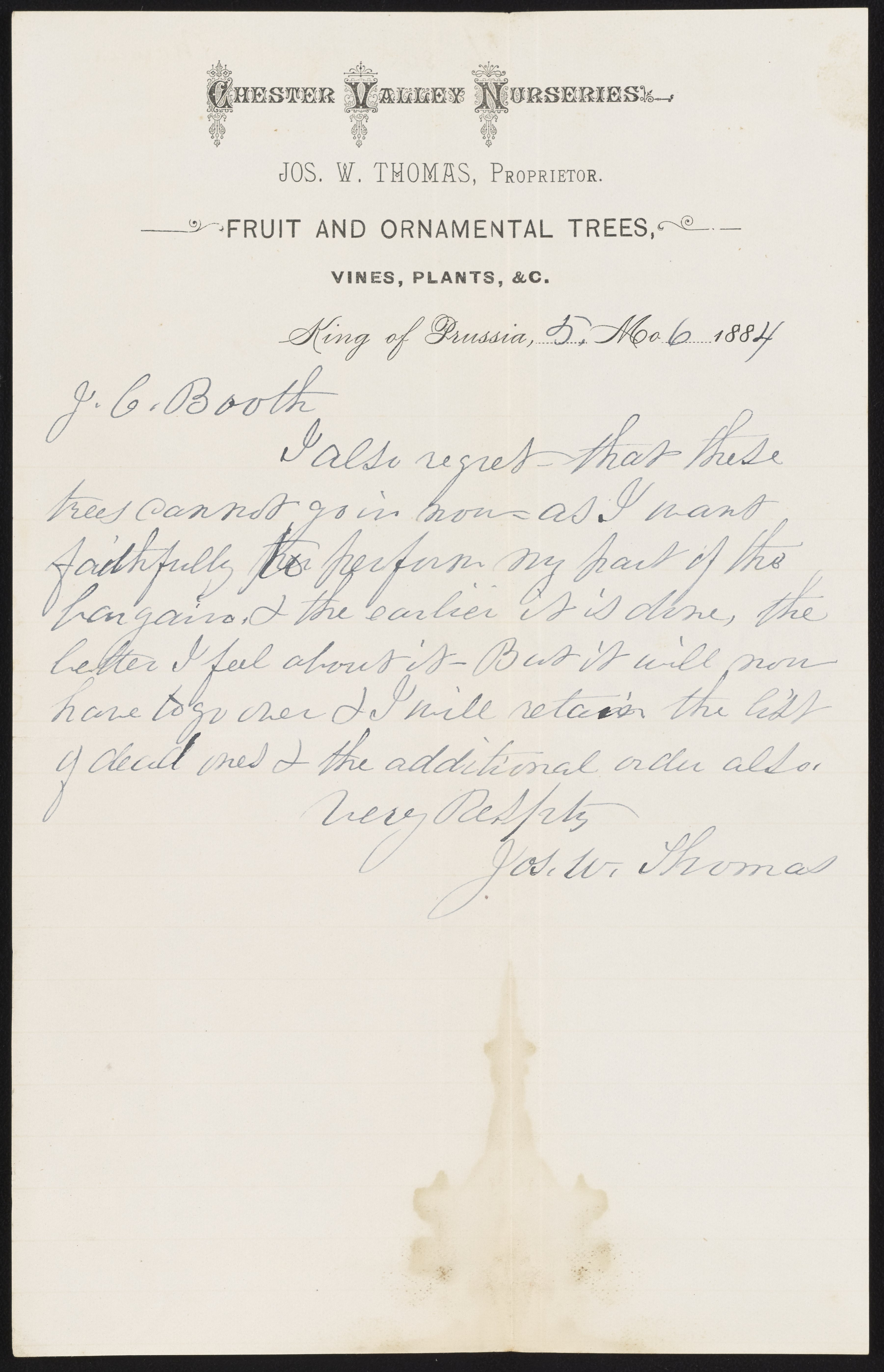 Thomas, Joseph W. “Letter from J.W. Thomas to James Curtis Booth, May 6, 1884,” May 6, 1886. Papers of James Curtis Booth, Box 2, Folder 10. Science History Institute. Philadelphia. https://digital.sciencehistory.org/works/pg2ki9y.