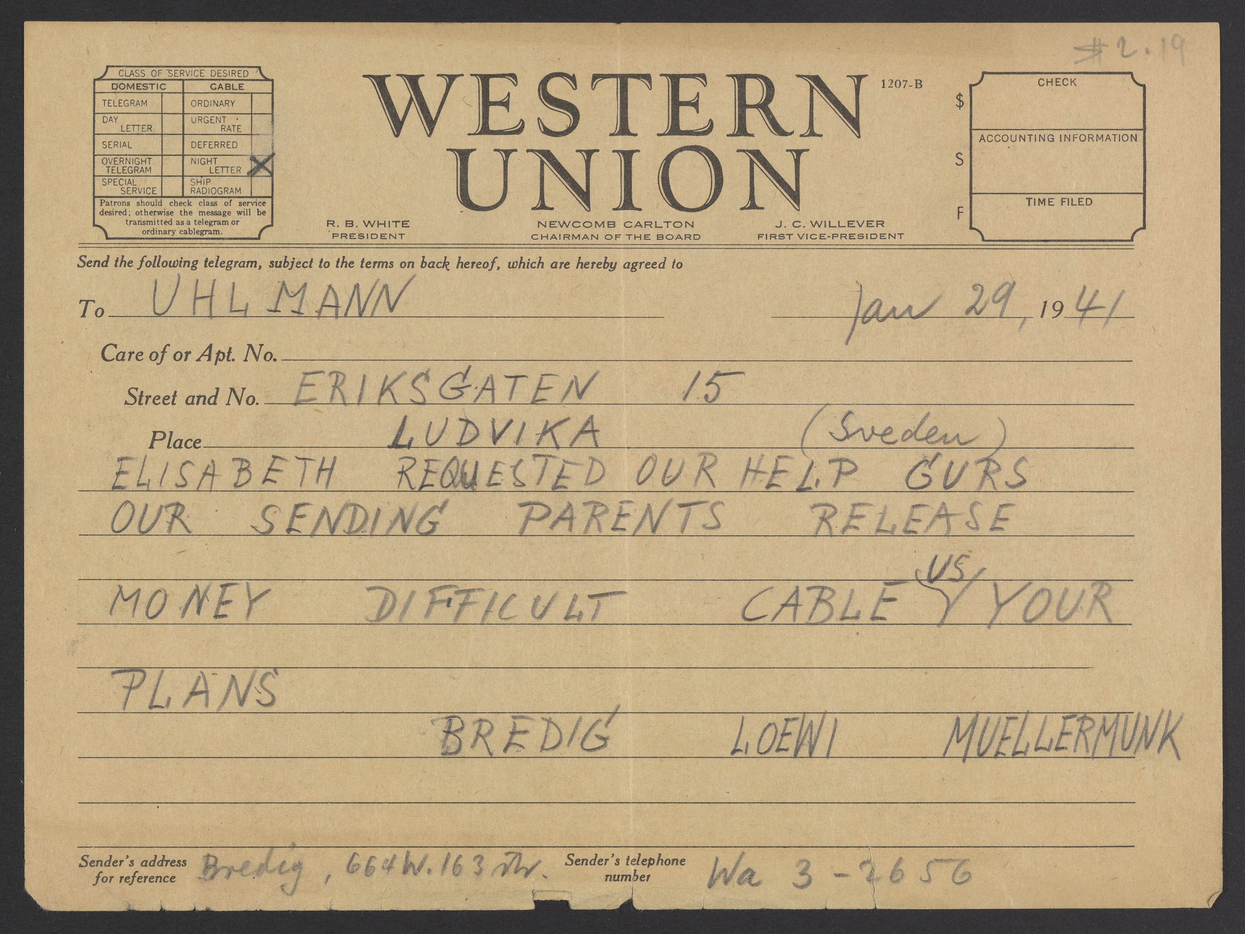 Telegram from Max Bredig to Uhlmann, January 29, 1941
