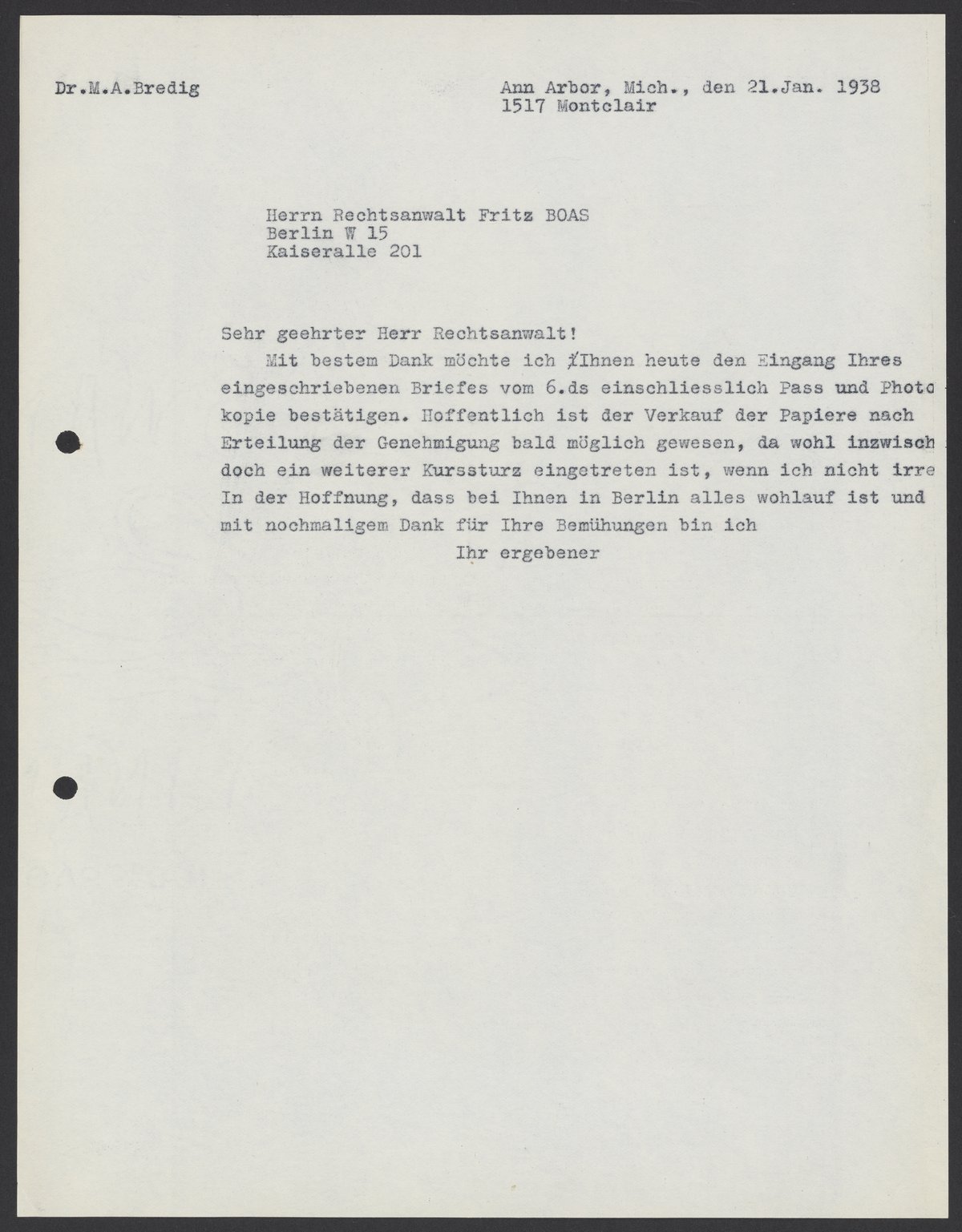 Letter from Max Bredig to Fritz Boas, January 1938